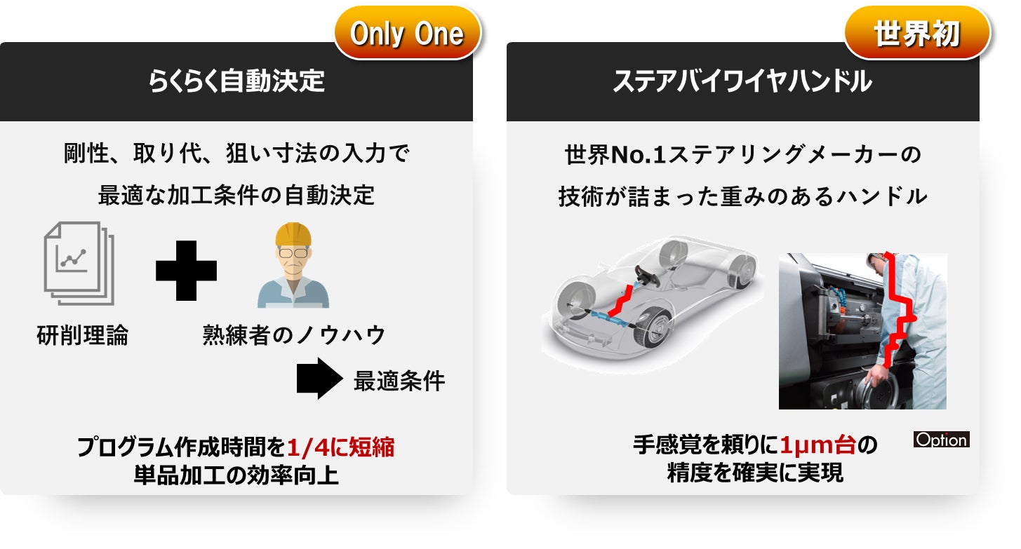 らくらく自動決定機能は、工作物の剛性や加工寸法などの入力で最適な研削加工条件を自動決定でき、プログラム作成時間を1/4に短縮し、単品加工の効率向上に貢献します。また、世界No.1ステアリングメーカーの技術を応用した新機能、作業経験豊富なベテランの方に満足いただける「ステアバイワイヤハンドル」を搭載します。といしと工作物の接触をハンドルに伝えることで、手動機のように手に伝わってくる感覚を頼りに1μm台の精度を確実に実現することができます。
