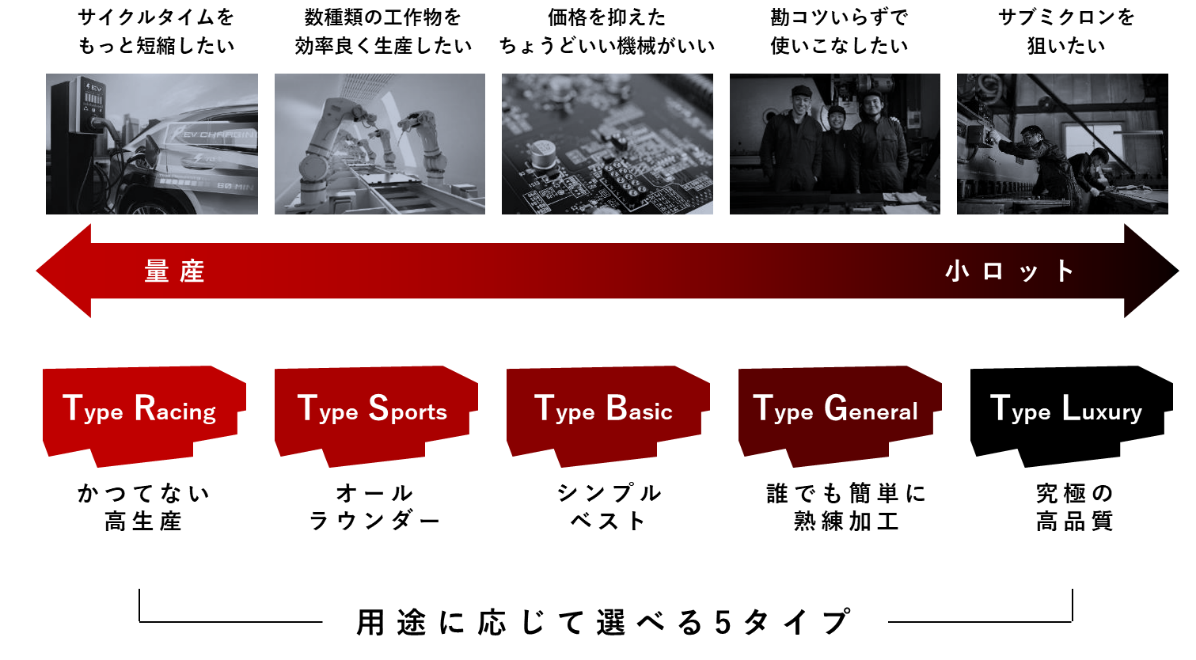 一般機械、スピンドル、ロール、工具、ツールホルダなどの研削に最適で、誰でも簡単に熟練加工ができるType Gと究極の高品質を実現するType Lをはじめ、5タイプすべてを販売します。