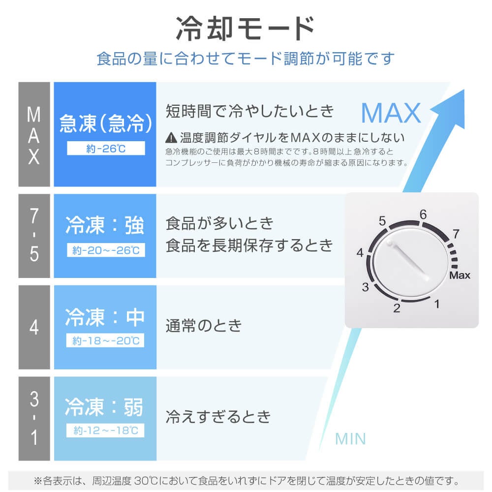 冷却性能は、日本工業規格最高水準のフォースターを搭載しております。冷却モードは「急凍(急冷)」「冷凍:強」「冷凍:中」「冷凍:弱」の4段階で、保存する食品の量や食材を保存する期間などに応じたモードを選択できます。
