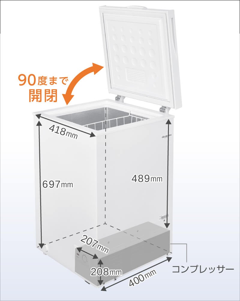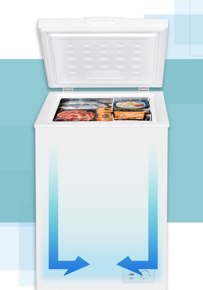 本製品は上開きタイプで、温かい空気よりも密度が高く下へ逃げる特性がある冷気が逃げにくい構造となっております。その為、扉を開けても庫内の温度が上がりにくく、食品を効率よく冷やすことが可能です。