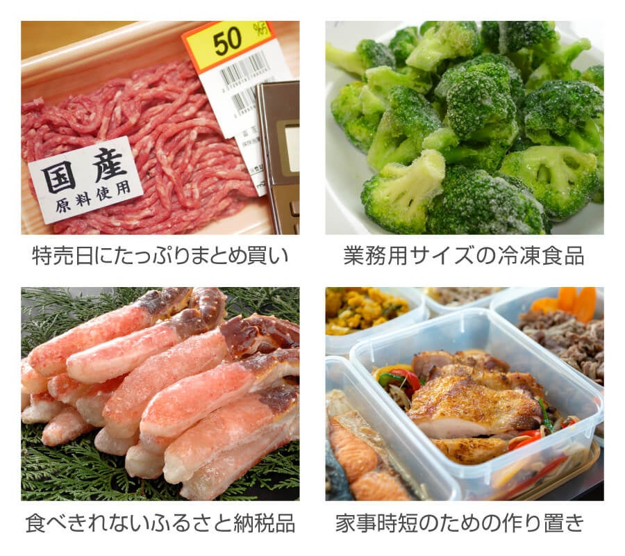 大量にまとめ買いした食材や業務用サイズの冷凍食品、ふるさと納税の返礼品や作り置きした料理などを保存する為の専用冷凍庫として最適な製品です。今使っている冷蔵庫に2台目としてプラスすることもおすすめです。
