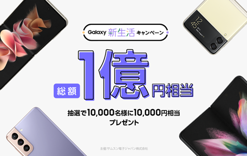 モバイル製品の世界的リーディングブランドであるGalaxyは、2022年2月18日(金)から3月31日(木)までの期間中に、au取扱店またはau Online Shopにて、対象のGalaxyスマートフォンをご購入・ご応募された方の中から抽選で10,000名様に「au PAY ギフトカード10,000円分」※など10,000円相当をプレゼントする『Galaxy新生活キャンペーン』を開始いたします。また、ご当選されなかった方にも、プチギフト(500円相当)をプレゼントいたします。