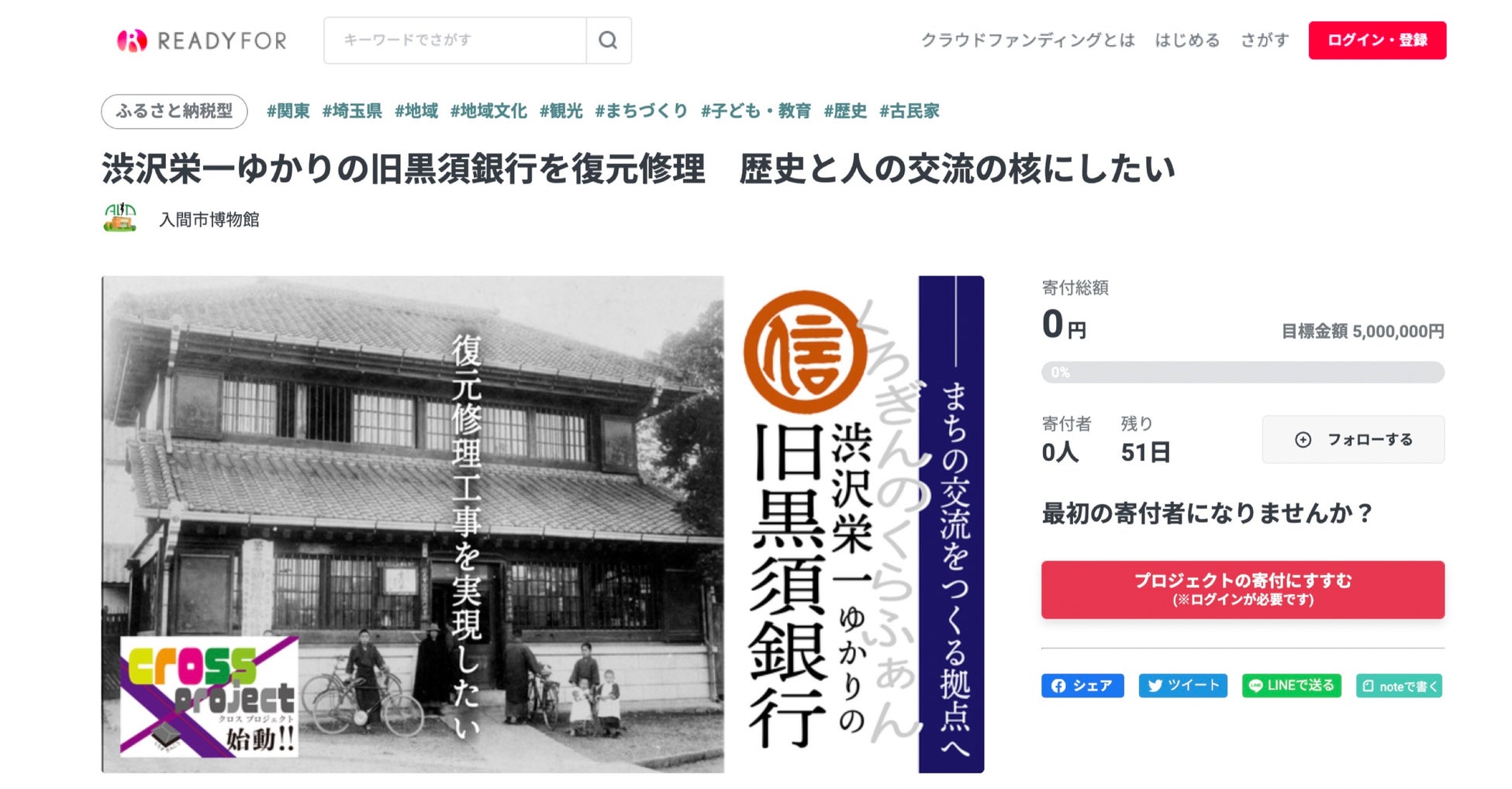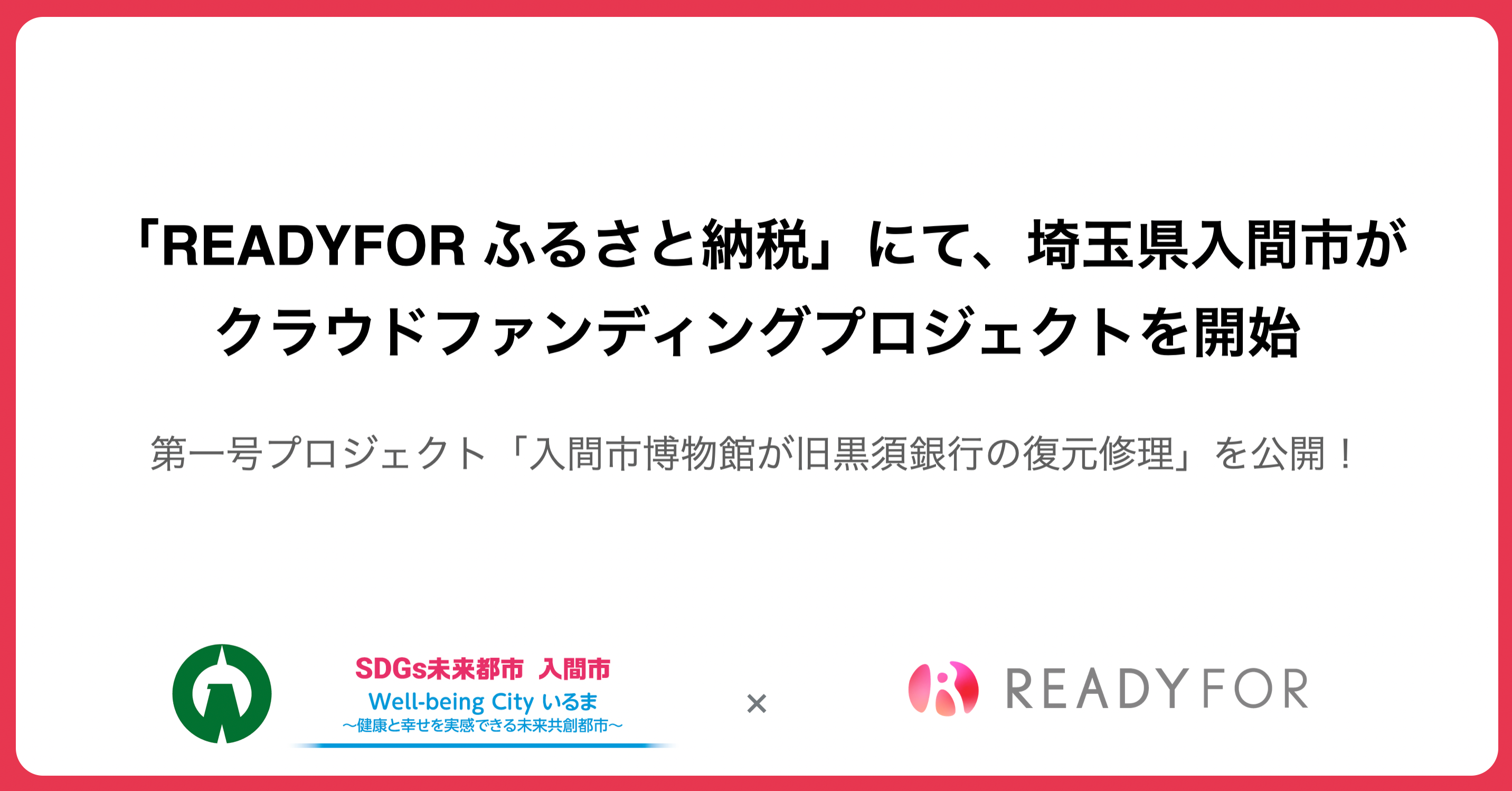 READYFOR株式会社(本社:東京都千代田区、代表取締役CEO:米良はるか)が運営する自治体向けクラウドファンディング「READYFOR ふるさと納税」にて、新たに埼玉県入間市がプロジェクトを開始いたします。提携後第一号となるクラウドファンディングプロジェクト「渋沢栄一ゆかりの旧黒須銀行を復元修理 歴史と人の交流の核にしたい」を本日公開いたします。
