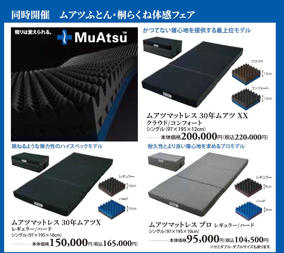 昭和西川株式会社(所在地:東京都中央区、代表:西川惠)は、10月16日(木)から20日(月)まで、まるひろ川越店6階ギャラリーにて特選寝具フェアを開催します。またMuAtsu(ムアツ)ふとん・桐らくね体感フェアも同時開催。希少なアイスランド産アイダーダック羽毛ふとんやオーストラリア産の良質ムートンをはじめ、進化を続けるMuAtsu(ムアツ)シリーズまで多彩な寝具を取り揃えてお待ちしております。