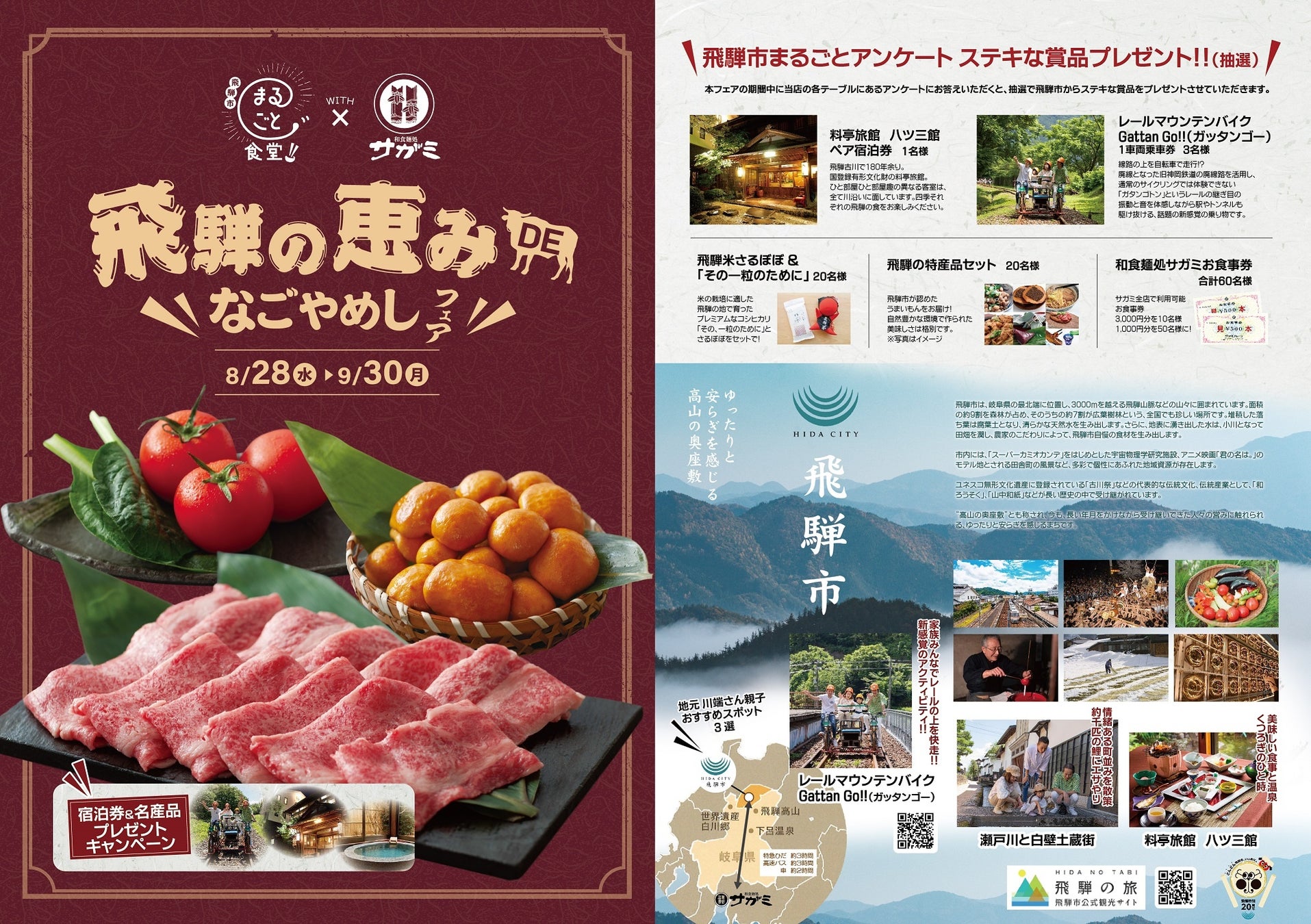 和食麺処サガミを展開するサガミレストランツ株式会社(本社:名古屋市守山区八剣2丁目118番地 代表取締役社長 鷲津 年春)は、愛知県名古屋市内全19店舗の和食麵処サガミにて2024年8月28日(水)から9月30日(月)まで、飛騨市の農家、飛騨特産食材を使用した期間限定の特別メニューを提供する「飛騨の恵み DE なごやめしフェア」を開催いたします。