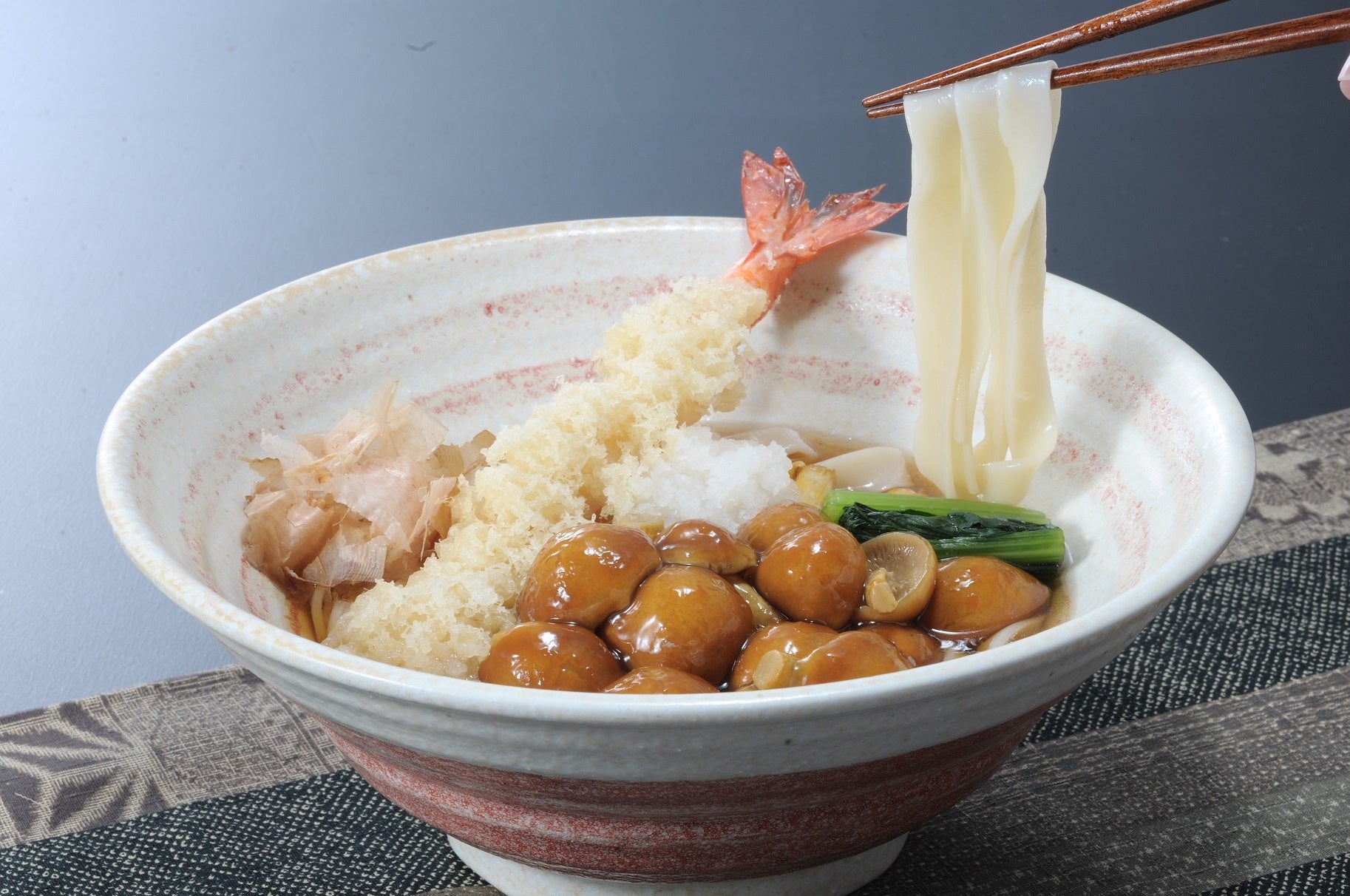 味乗りが良いきしめんを使用することで、飛騨地域の自然の恵みが生んだ なめこの旨味と食感を存分に味わえます。サガミ自慢の大海老天がおいしさを引き立てます。