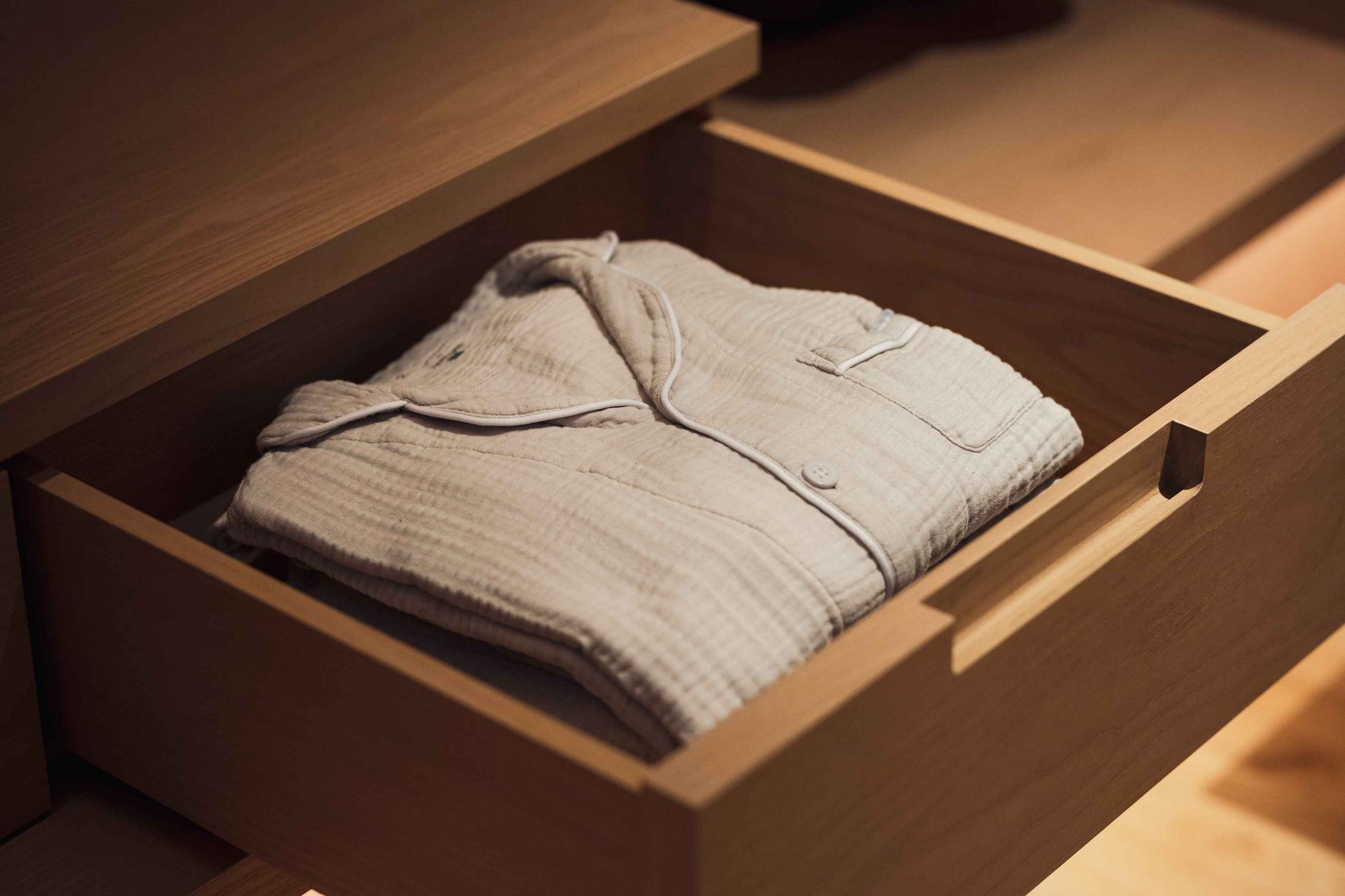 ホテルならではの仕様感にもこだわり、大人用サイズに加えてキッズサイズのご用意もございます。客室にご用意しているウェアは、同ホテル内のブティックにおいてもご購入いただけます。