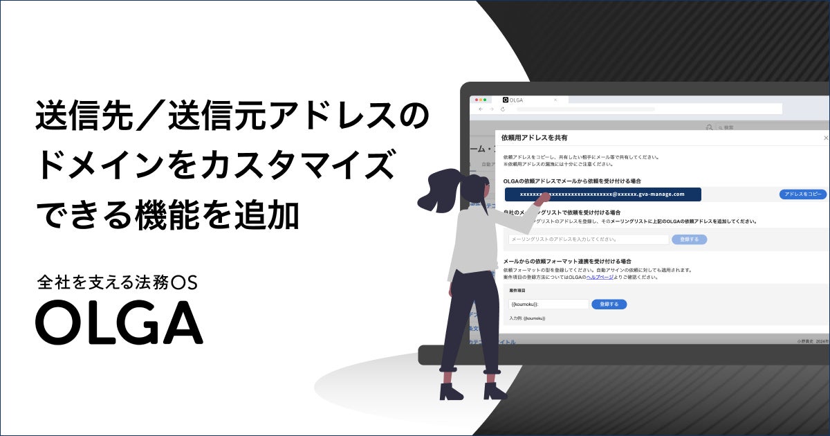 GVA TECH株式会社(本社:東京都渋谷区、代表取締役:山本 俊、以下GVA TECH)は、OLGAから通知される法務案件依頼や返信などのメールアドレスのドメインを変更できる新たなオプション機能をリリースしたことをお知らせいたします。