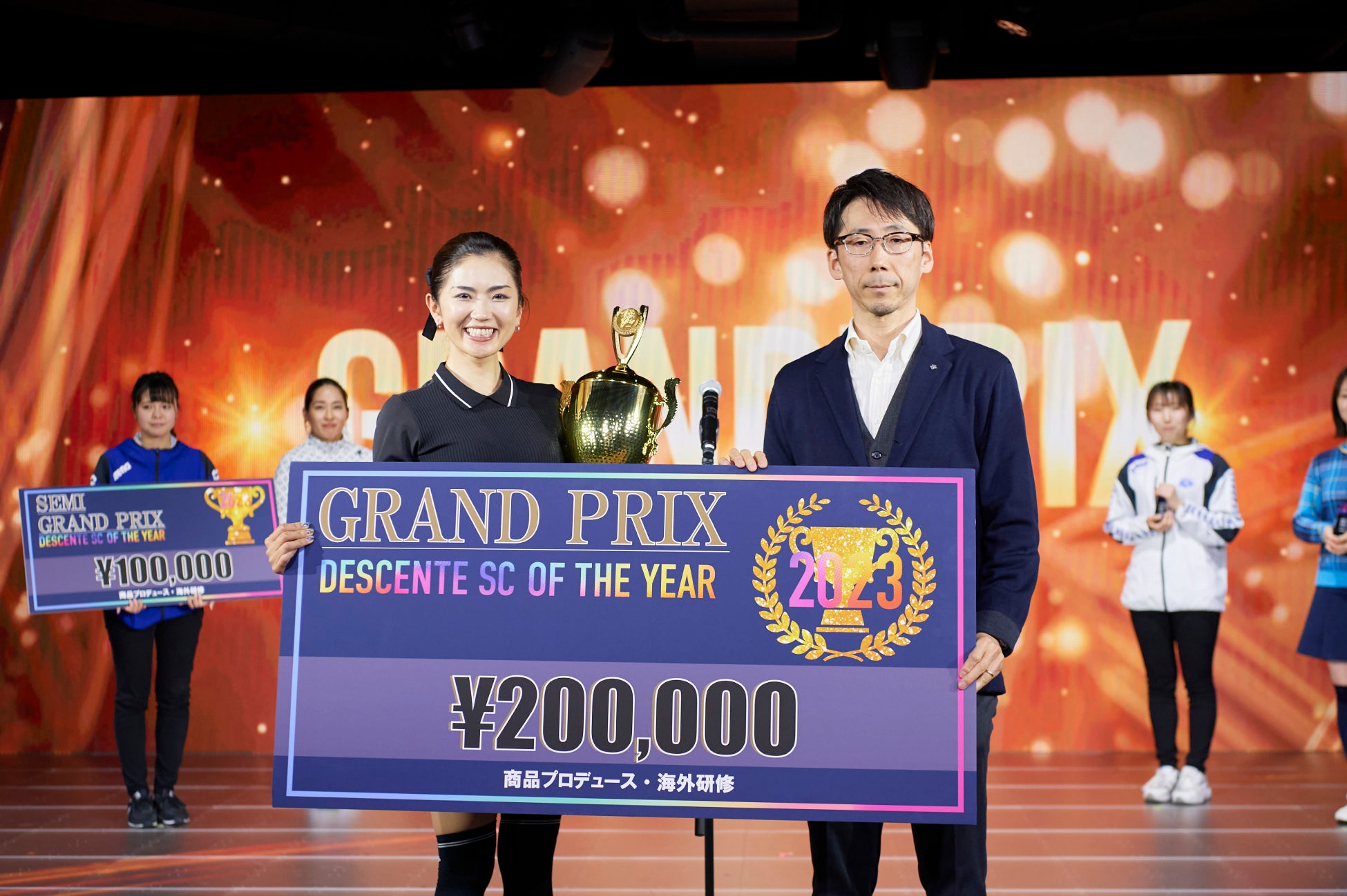 本イベントは、販売の最前線に立つSCが日頃店舗内外で行っている工夫や技術が顧客満足やブランド価値向上にどのように貢献しているのか、その存在意義を証明するとともに、SCの先にいらっしゃる「お客様」へ伝えることの重要性を全社員が改めて共有することを目的に実施しています。今年度は、全社員による複数ステージに渡る投票を経て全国No.1販売スタッフを決定する“DESCENTE SC OF THE YEAR(デサント エスシー オブ ザ イヤー)”として昨年に続き2回目の開催となり、2024年2月21日(水)に 決勝ラウンドを実施。ファイナリストは緊張しながらも日頃の接客スキルや想いを存分に披露し、受賞者が決定いたしました。受賞者には賞金および副賞として商品プロデュースへの参画権が授与されました。