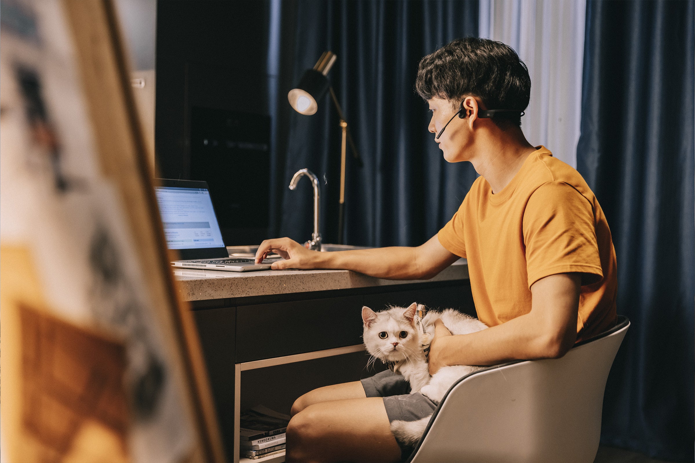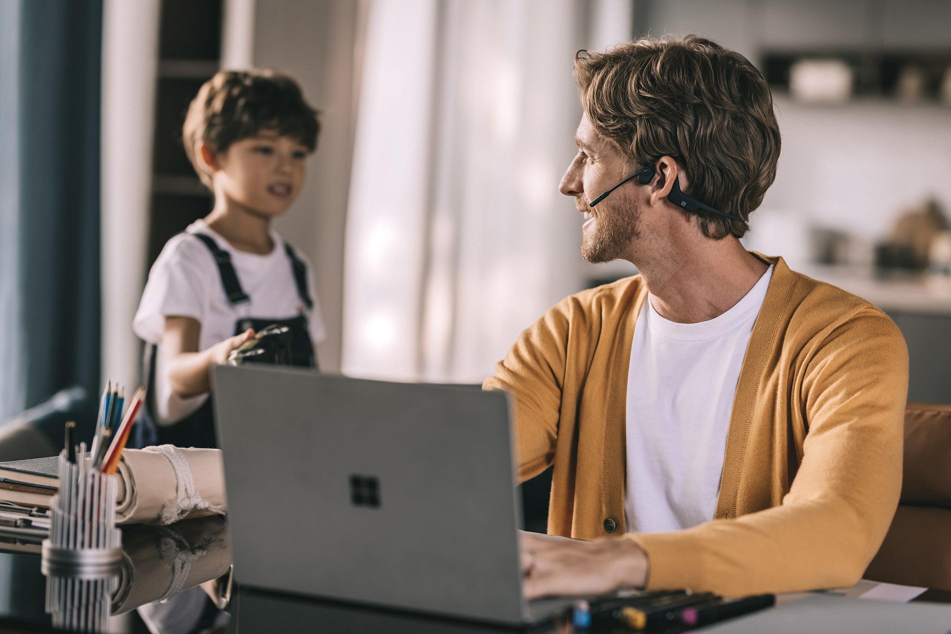 耳を塞ぐことなく、しかも高品質なマイクでハンズフリー通話を実現できる OpenComm UCは、同僚との会話と画面の向こうの相手とのコミュニケーションを同時に行うことができます。在宅勤務の場合、仕事とプライベートの両立が可能です。オンライン会議に参加していても子供やペット、パートナーに気を配ることができるので安心して会議に参加できます。