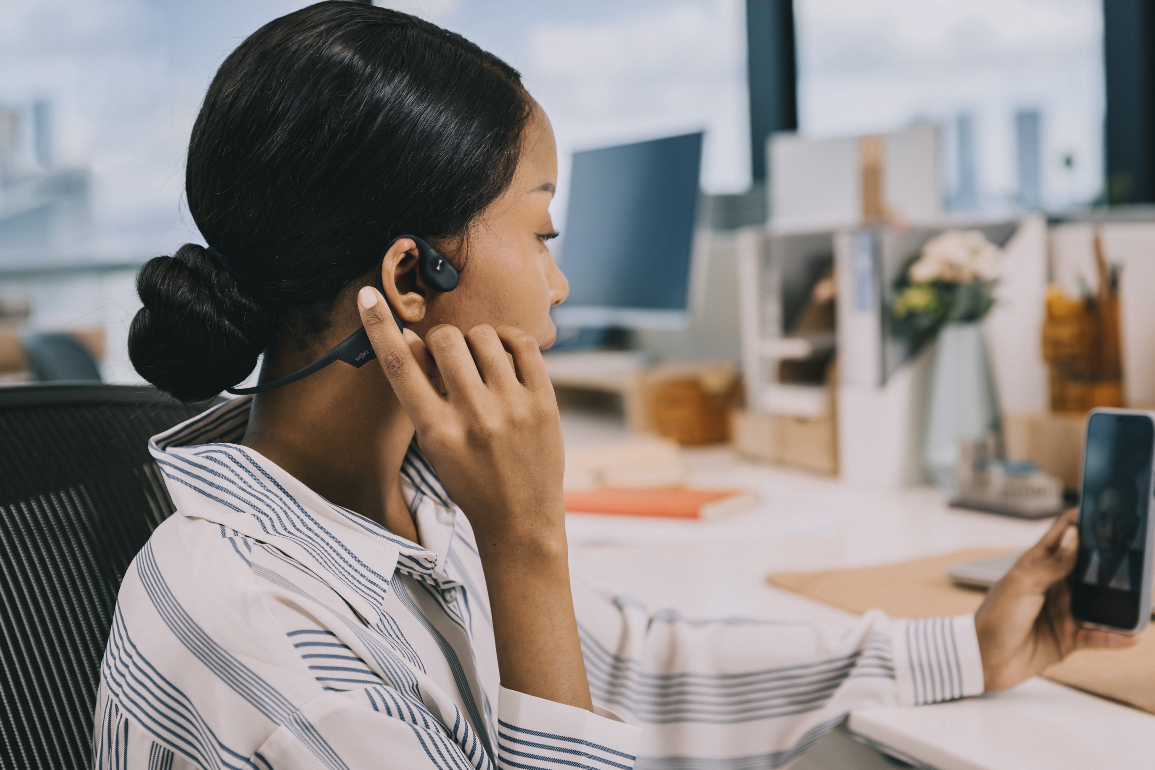 OpenComm UCは、オフィスや自宅での仕事の効率性を高めるために設計されました。コンピュータとの接続安定性が強化され、Zoom、Teams、Skypeなどの主要なコミュニケーション・プラットフォームと連携します。耳を塞がない骨伝導ヘッドセットなので周囲の音を聴きながらも、画面の向こうの相手の声も聞き逃しません。クリアな通話が可能な高品質なマイクを搭載し、使用しないときはマイクを折り畳むこともできます。もちろん音楽の再生やYouTubeの視聴にも適しているので、ビジネスはもちろんオフタイムにも活用できます。