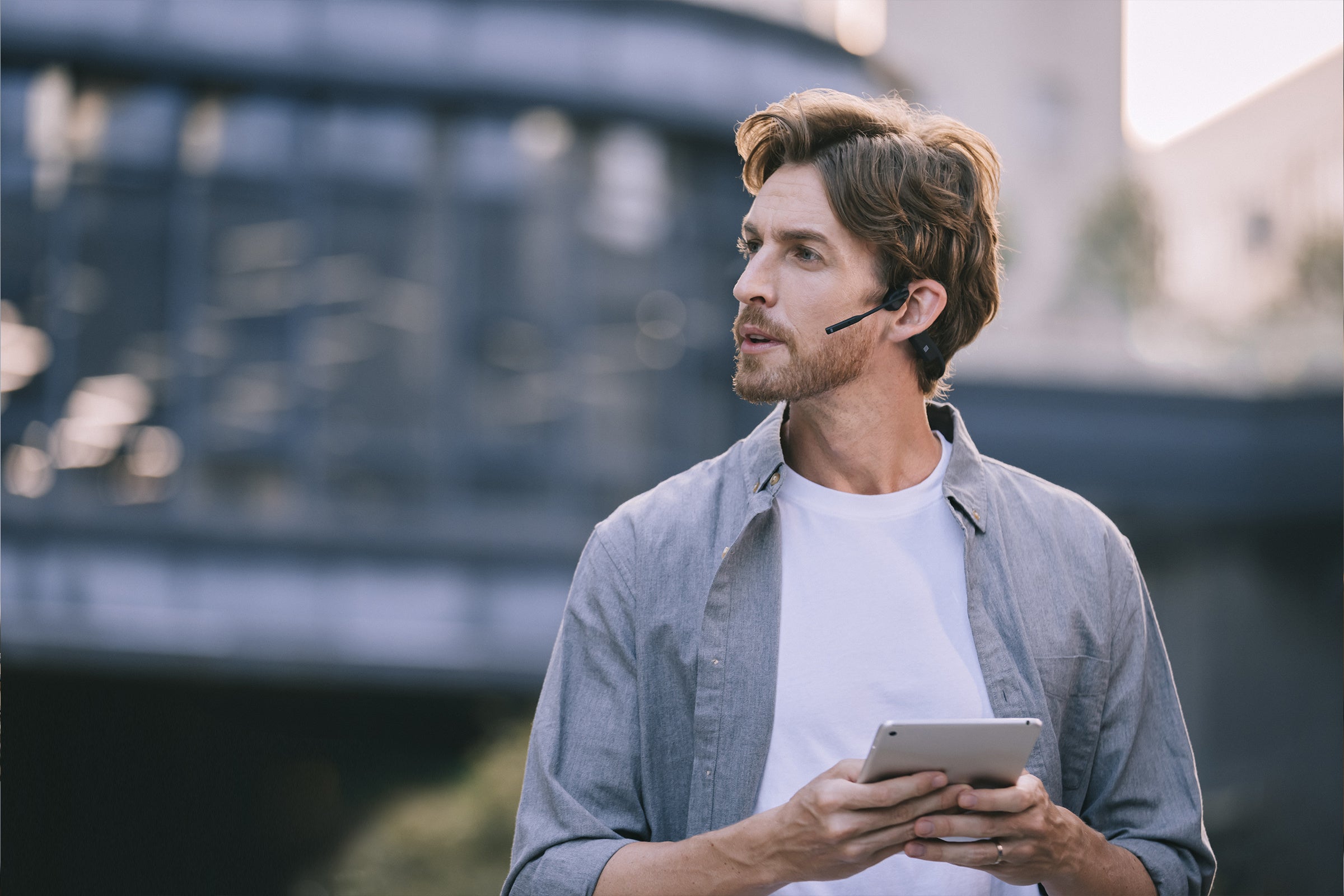 OpenComm UCのネックバンドは柔軟性と耐久性を兼ね備えたチタニウム製です。どんな人にもフィットし、快適な装着感でご使用いただけます。また、サングラスや帽子と一緒に装着しても邪魔になりません。