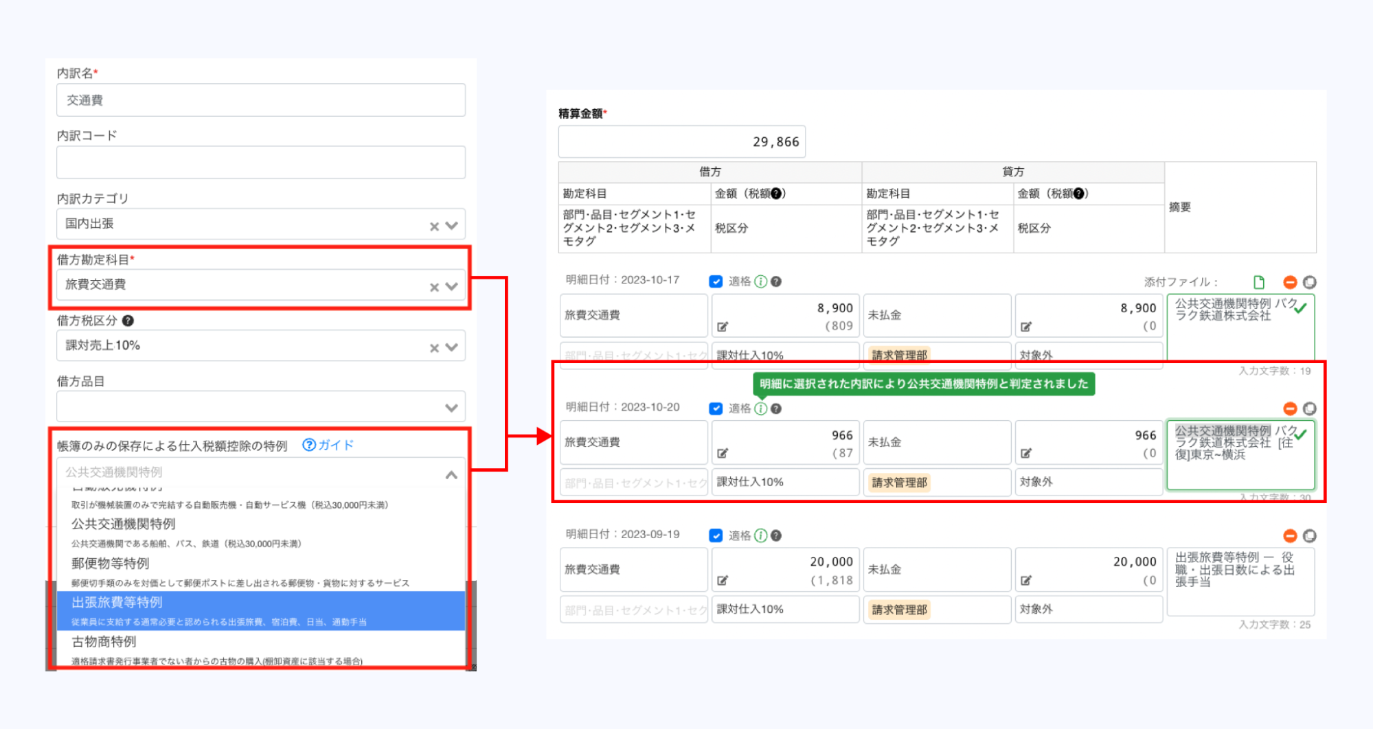 例えば、3万円未満の公共交通機関利用などで証憑が存在しない場合でも、内訳に「特例」を設定しておくことで、摘要欄に「公共交通機関特例」の旨が自動で記載され、適切な税区分が選択されます。