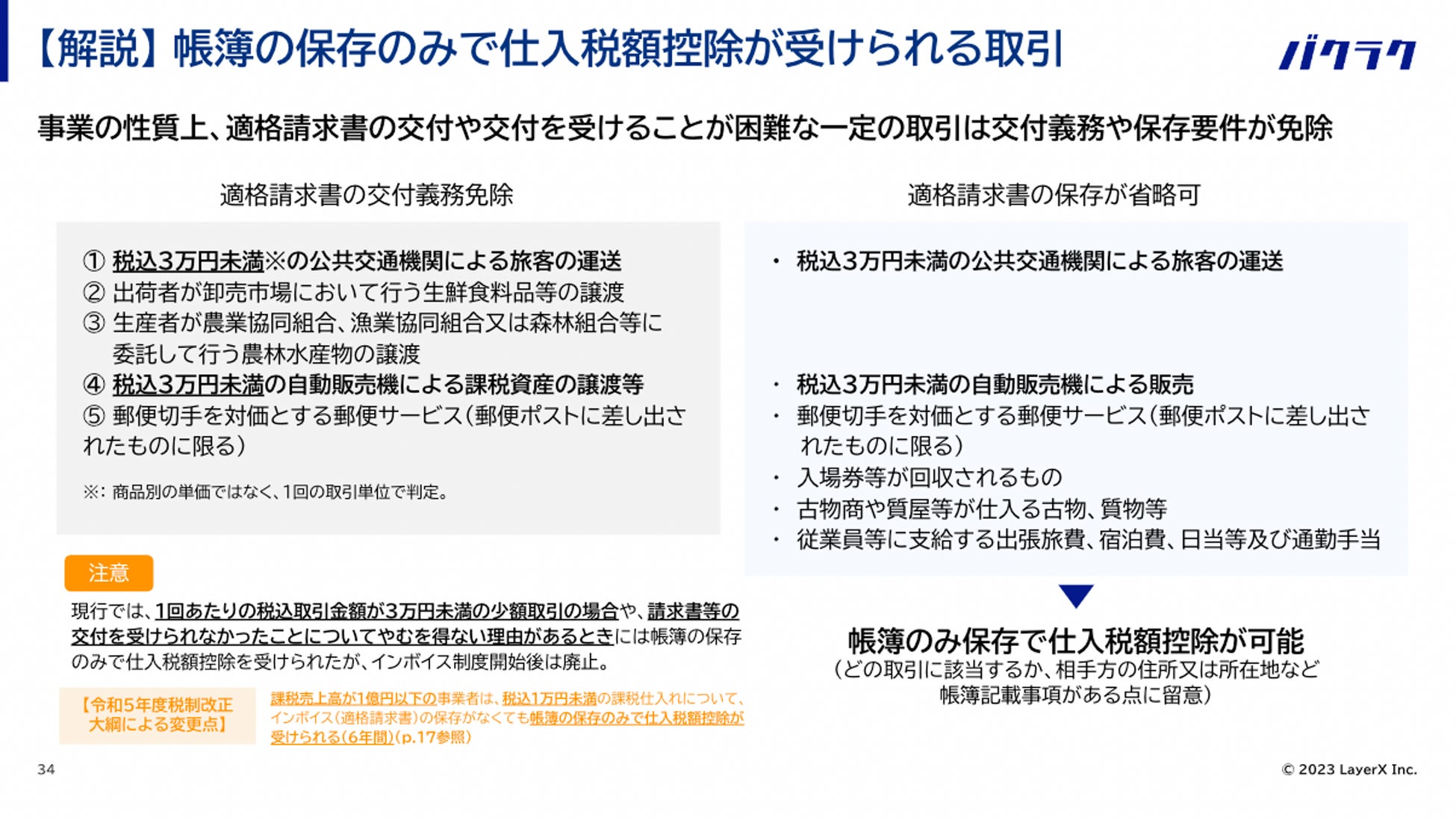 インボイス制度開始後は取引の金額に関わらず、原則、請求書・領収書等のインボイスが必要になりますが、3万円未満の公共交通機関利用など一定の取引は、インボイスがなくても一定の記載事項を満たした帳簿の保存のみで仕入税額控除ができる「特例」の取引として認められています。
