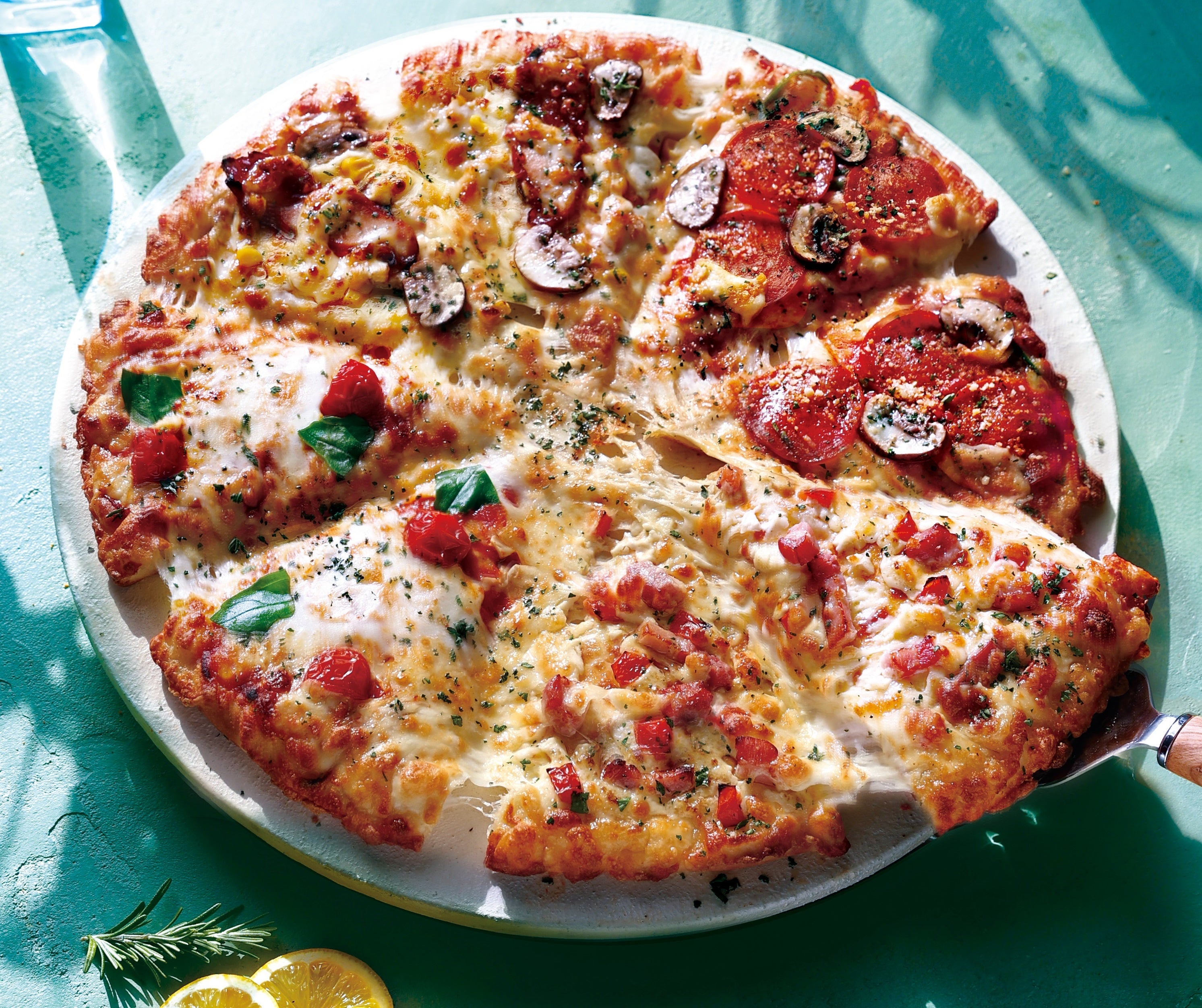 この夏新登場!イチキュッパ(Mサイズ税抜1,980円)の『熟成パンチェッタのよくばりクォーター』は、丁寧に低温で加熱した熟成パンチェッタとさわやかに香る特製瀬戸内レモンソースが相性抜群の新作「熟成パンチェッタと瀬戸内レモンソース」、定番メニューで常に人気の「テリヤキチキン」と「マルゲリータ」、熟成サラミの旨みとパルメザンチーズのコクが味わえる「ペパロニラバー」の、ピザーラが誇るバリエーション豊かな4種が1枚に集結したクォーターピザです。