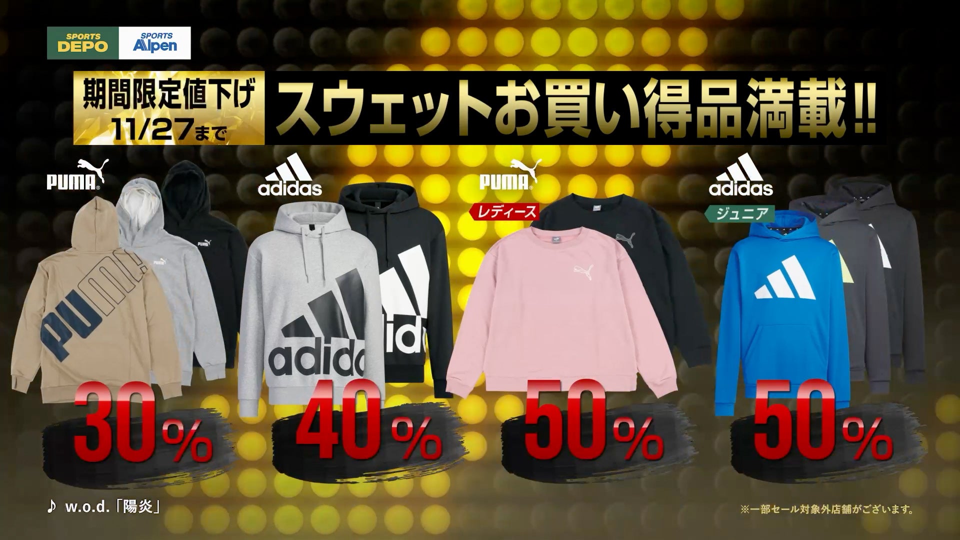 「ブラックフライデーセール」では、これからの季節に嬉しい、アディダスのアウターが最大40%OFF、アンダーアーマー・ニューバランス のアウターも最大30%OFFとお買得です。さらに、今すぐ欲しいスウェット等は最大50%OFFとなります。加えて、ランニングシューズやスニーカーも4,999円・5,999円・6,999円(税込)などお買得価格が続出。また、野球バット・サッカースパイク・バスケットボールシューズ・テニスシューズをはじめとした各種スポーツ関連グッズなどもお買得価格で多数ご用意いたしました。