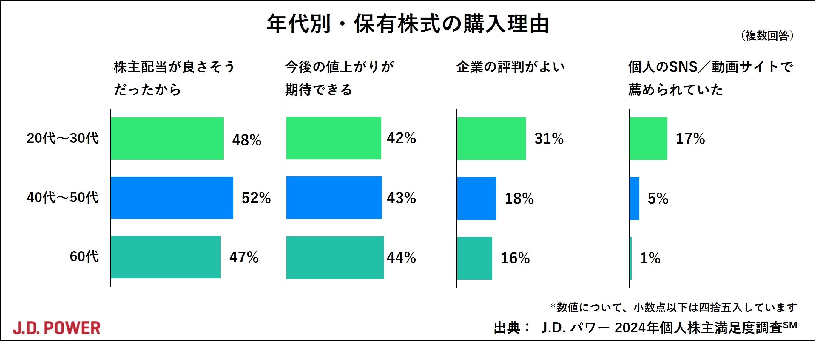一方、年代別では購入理由に違いが見られた。「株主配当が良さそうだったから」など上位3項目では大きな差が見られないものの、「企業の評判がよい」は40~50代では18%、60代では16%であるのに対して、20~30代では31%と10ポイント以上の差が見られた。また、「個人のSNS/動画サイトで薦められていた」は40~50代では5%、60代では1%とごく僅かなのに対し、20~30代では17%とこちらも10ポイント以上の差が見られ、SNSや動画サイトの影響が若年層で特に大きいことが確認された。