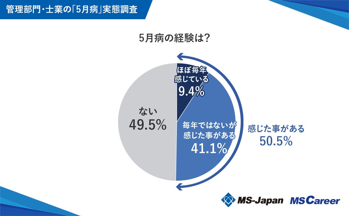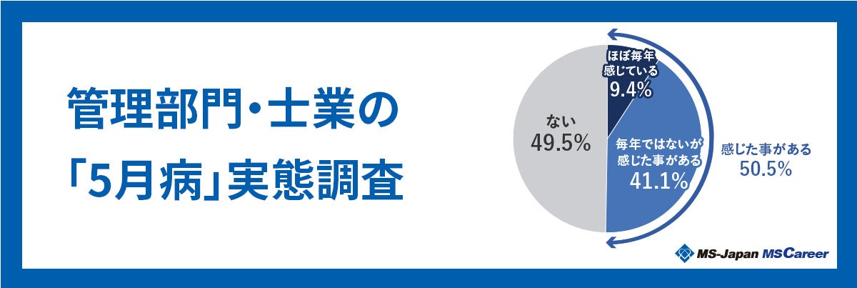この度、MS-Japanが運営する管理部門・士業の総合転職サービス「MS Career(エムエスキャリア)」は、【管理部門・士業の「5月病」実態調査】を発表いたしました。本調査は、管理部門・士業のためのビジネスメディア「Manegy(マネジー)」にて管理部門・士業における「5月病」の実態をアンケート調査し、結果をまとめました。