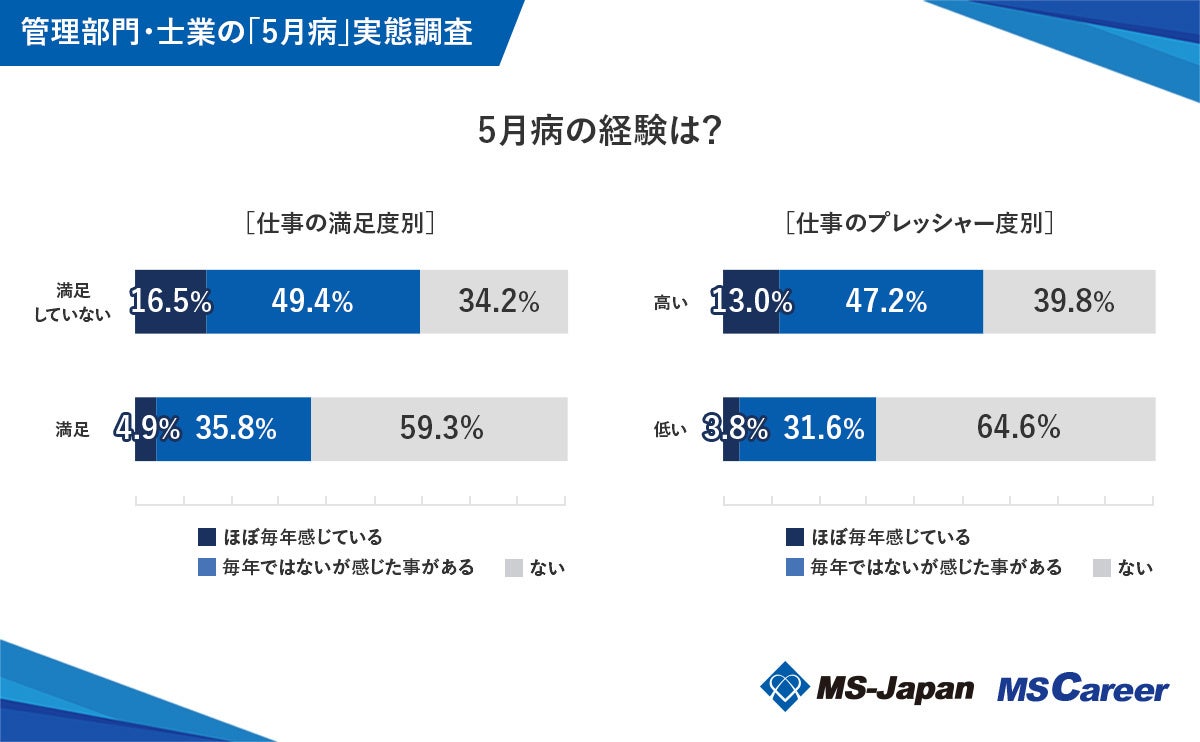 プレッシャーが高い人は低い人と比較し、5月病経験率が1.7倍に、仕事に満足していない人は満足している人と比較し、経験率が1.6倍別に増えることが明らかになりました。