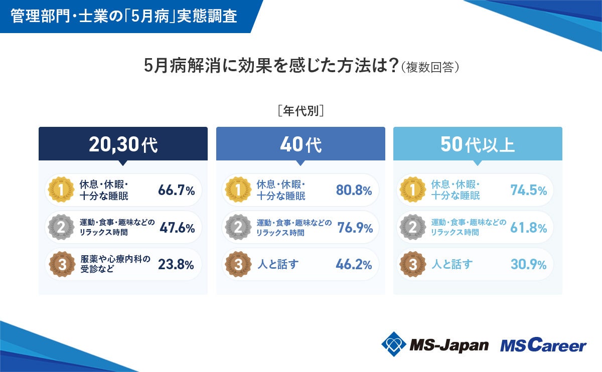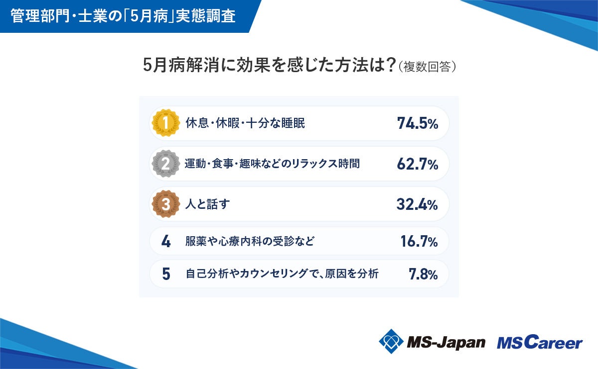 5月病解消に効果を感じた方法に関する調査では、第1位は「休息・休暇・十分な睡眠(74.5%)」で7割の人から選ばれました。