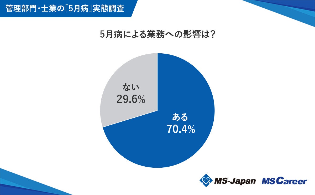 最後に5月病による業務の影響に関する調査では、70.4%の方が「影響を感じた」ことが明らかになりました。