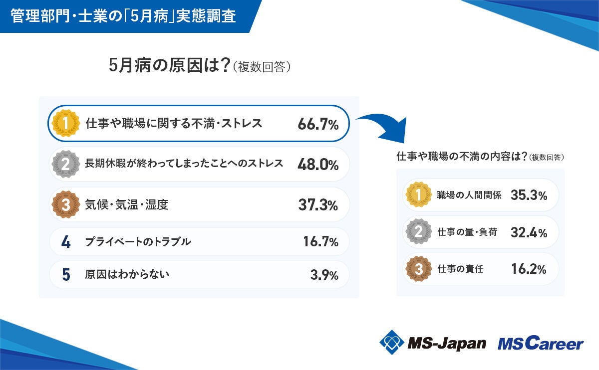 ②【5月病の原因は「仕事や職場に関する不満・ストレス」が66.7%】