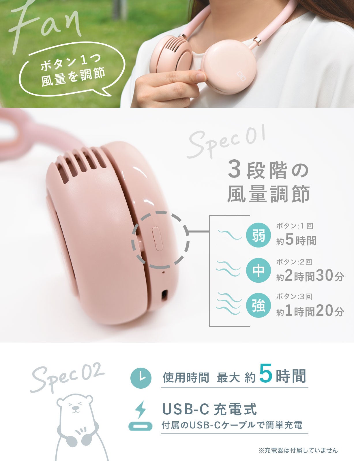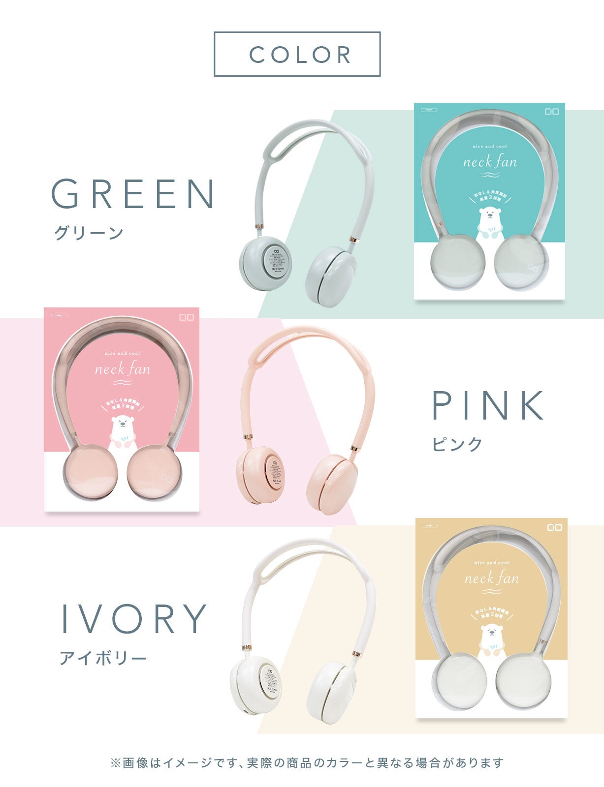 従来の首掛け扇風機とは異なり、髪の毛を巻き込みにくい羽なし(ブレードレス)設計。ロングヘアーの方でもお使いいただけます。かわいいパステルカラー(ピンク・グリーン・アイボリー)を取り揃えました。コードレスでヘッドフォンのようなスタイリッシュなデザインを実現。カジュアルに使用できます。