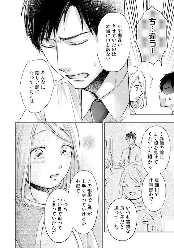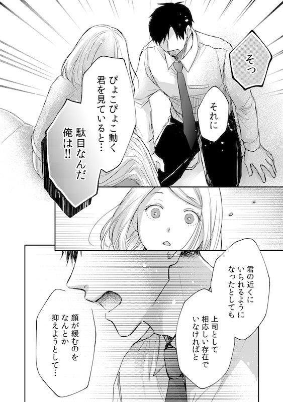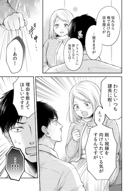 ぽっちゃりがコンプレックスの榎本沙奈は、憧れていた部署への異動初日からなぜか課長の日下部誠司に睨まれていた。前の部署ではぽっちゃりな体型が原因で同僚との関係がうまくいかなかった沙奈。課長が睨んでくるのは、わたしの体型を不快に思って…? だけど時折優しさも見せる課長。ますます睨まれている原因がわからなくなった沙奈は、思い切って課長に理由を聞いてみることに。そうして課長から告げられたのはまさかの言葉で――!?