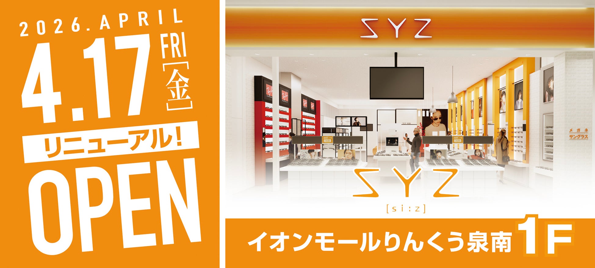 メガネ・補聴器を取り扱う「AIGAN」(https://www.aigan.co.jp/)を運営する愛眼株式会社(本社:大阪市天王寺区、代表取締役社長:佐々 昌俊)は、大阪府泉南市のイオンモールりんくう泉南1Fに出店するアイウェアショップ「SYZ イオンモールりんくう泉南店」を、2026年4月17日(金)にリニューアルオープンいたしました。