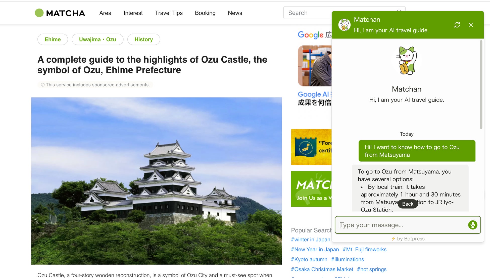 AIチャットボットは訪日客の質問にMATCHAに掲載されている情報から回答をし、MATCHAの関連記事をレコメンドします。MATCHAは日本のインバウンド最大級のメディアで、月間300万ユーザーが訪れ、累計20,000記事以上の豊富なコンテンツを提供しています。