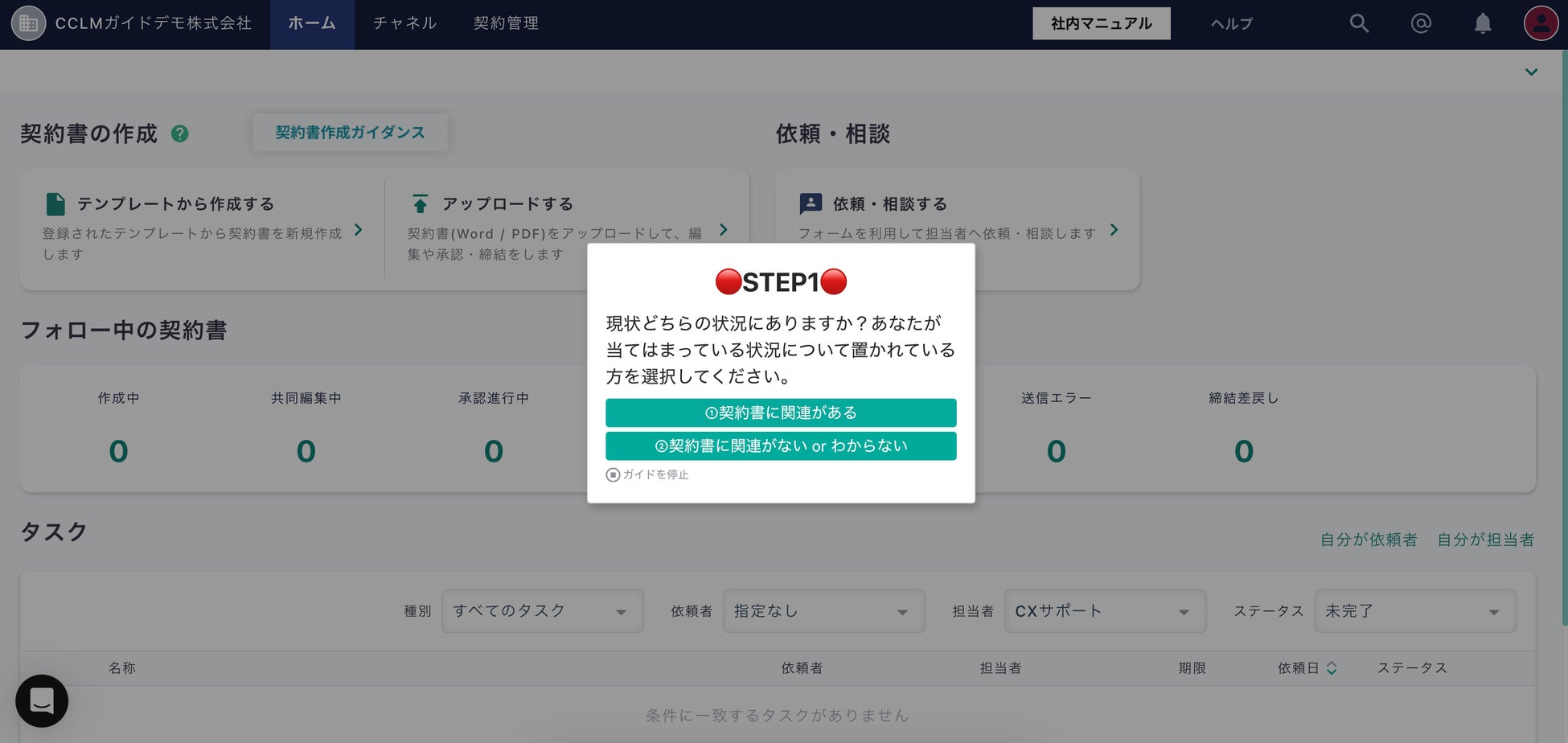 当社が提供する「テックタッチ」は、Webシステム画面上で操作ガイドを作成・表示することができます。ガイドを表示することで、「ContractS CLM」の便利な使い方や、有用な新機能を直接ユーザーに案内することが可能となり、利用促進に貢献します。