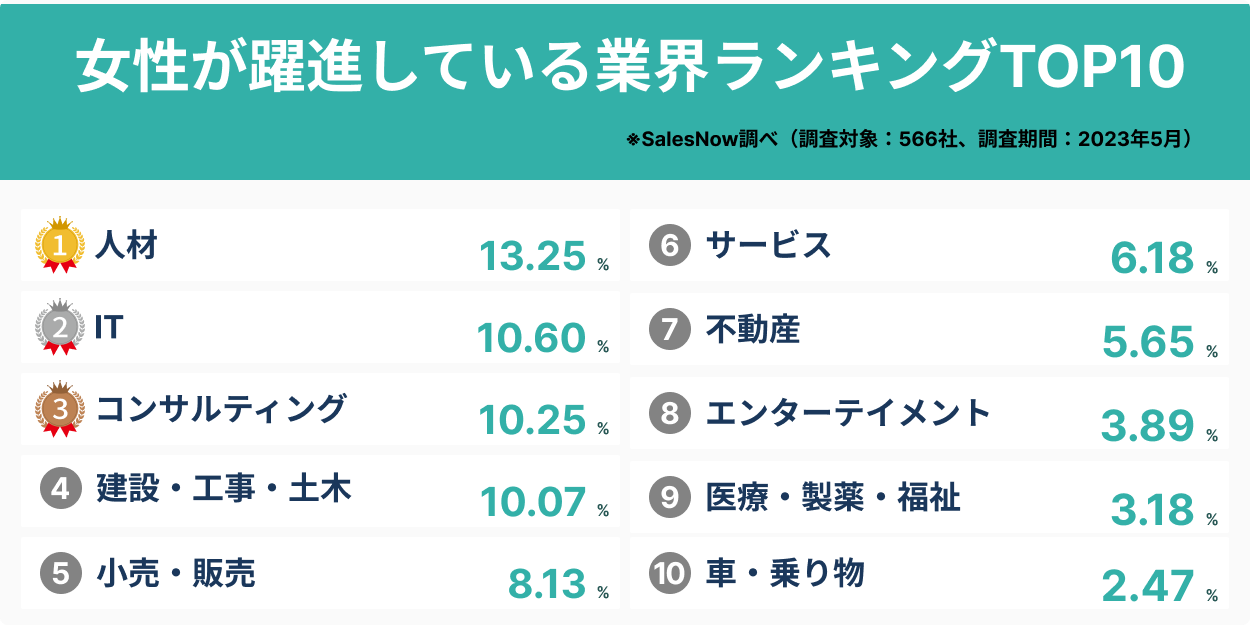 日本全国500万社以上のデータベースからの調査レポート!ジェンダー平等な業界の先駆者!女性が躍進する業界ランキングTOP10発表/SalesNow DBレポート