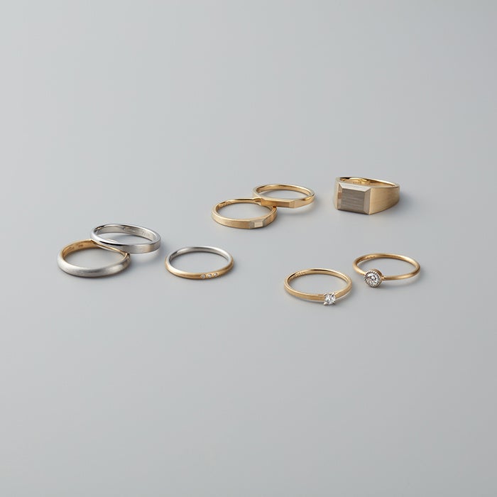 おふたりで同じ型のリングをお選びいただける他、地金や、仕上げ方を変える事でそれぞれのスタイルにあわせたリングをお仕立てする事も可能です。
