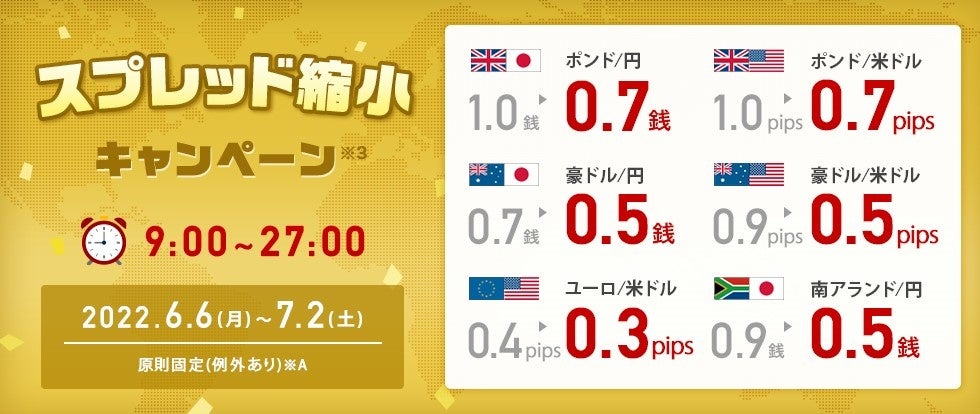 ※3 「提示時間帯拡大!スプレッド縮小キャンペーン」スプレッド(対象期間:2022年6月6日(月)午前9時00分~2022年7月2日(土)午前3時00分、提示時間帯:対象期間中の各営業日午前9時~翌午前3時)