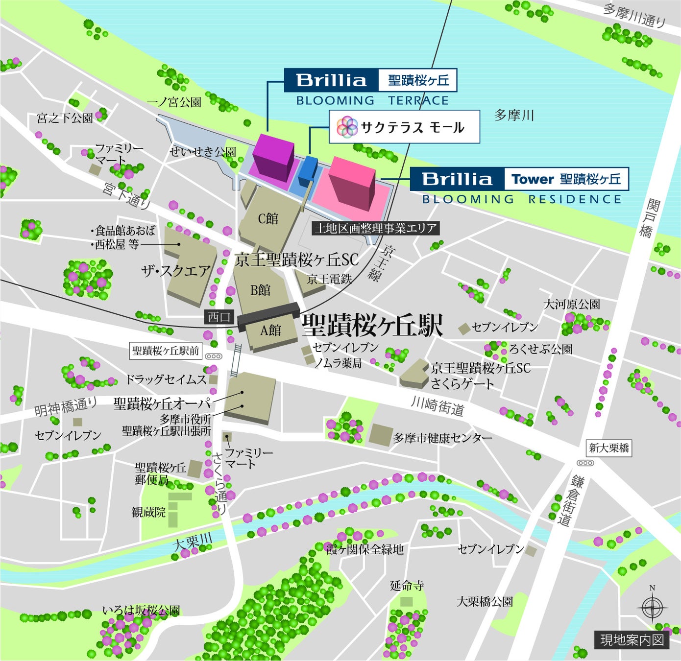 本地区は、京王線「聖蹟桜ヶ丘」駅周辺を中心に大規模な商業施設や生活利便施設が複数ある一方で、多摩川に隣接するエリアでは低未利用地も多く残されていることから、多摩市の定める地区計画において、広域拠点としてのにぎわいの創出や、多摩川の「親水軸」の形成およびアクセスの改善等が目標に位置付けられています。