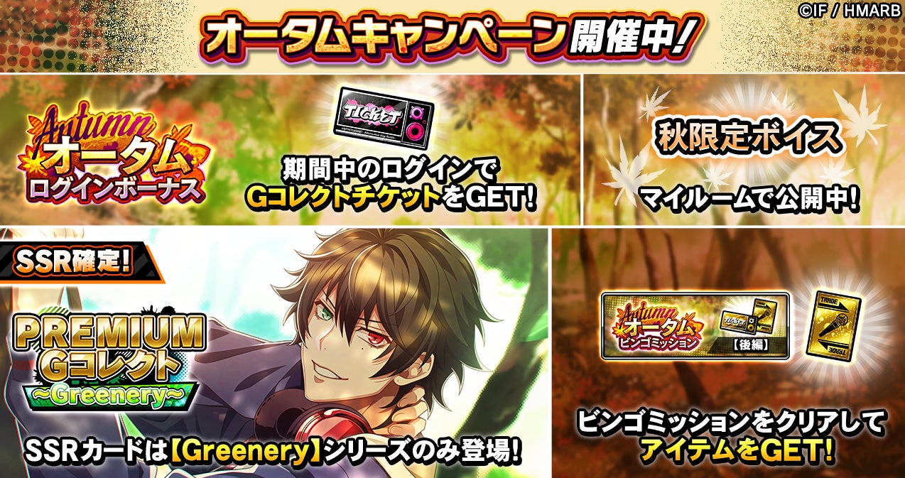 期間中、ビンゴミッションやログインボーナスを開催しているほか、マイルームでは「秋」に関するボイスを公開中です。