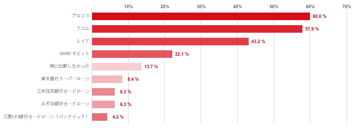 アイフルと同じ大手の消費者金融を比較対象としている人が多かった。アイフルの金利はもちろん、審査や手続きの利便性・スピードなどを比べていると考えられる。