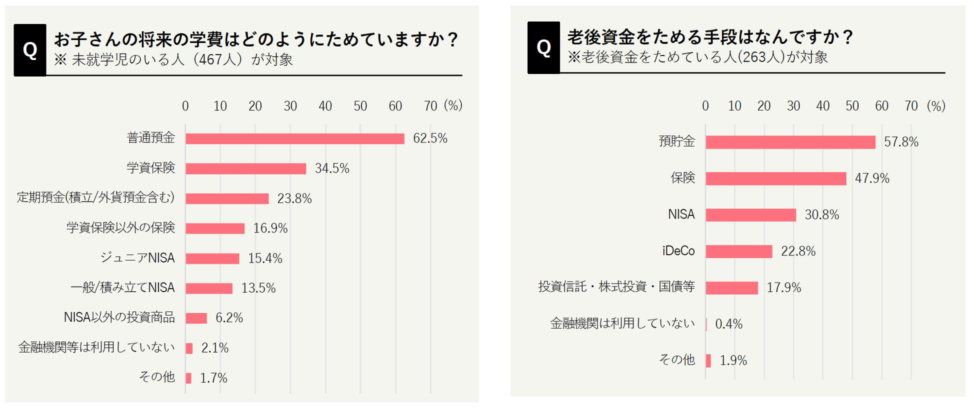将来の学費・老後資金ともに7割を超える人が「不安」と回答。教育費のため方としては、「普通預金」(62.5%)、「学資保険」(34.5%)、「定期預金(積立/外貨定期含む)」(23.8%)が上位3位に(未就学児のいる人467人が対象、複数回答)。老後資金は「預貯金」(57.8%)、「保険」(47.9%)、「NISA」(30.8%)となりました(老後資金をためている人263人が対象、複数回答)。いずれもトップ2は「普通預金」「保険」となり、元本割れしない安心感のある商品での貯蓄がメインとなっていることがわかりました。
