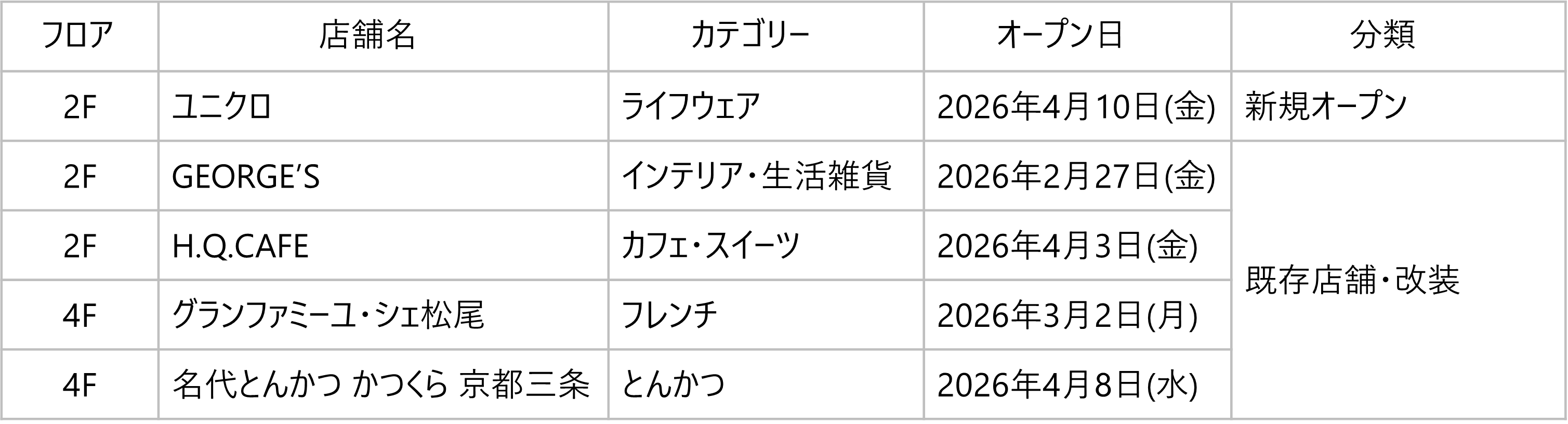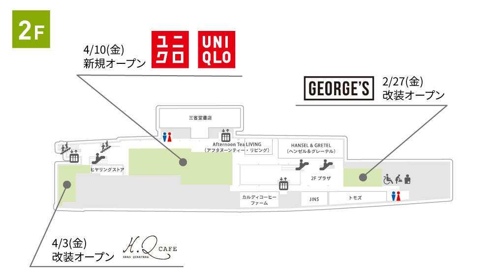 第2弾リニューアルでは、ユニクロの新規オープンに加え、インテリア・生活雑貨のGEORGE’Sやフレンチレストランのグランファミーユ・シェ松尾などの既存店舗も装いを新たにリニューアルオープンします。