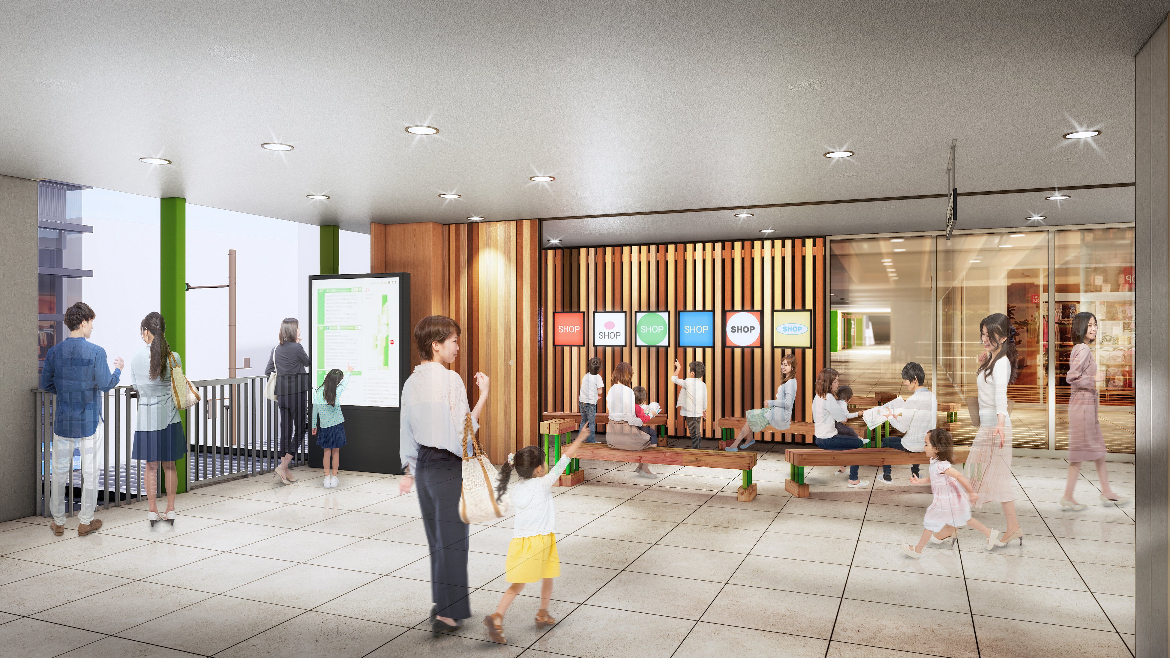 館内共用部では、東京都内で育成・生産された木材「多摩山麓産材」を活用し、駅コンコースからつながるエントランス、館内通路などに木の温もりを取り入れました。また、レストスペースに新たに設置したベンチにも多摩山麓産材を使用し、お買い物の合間にくつろげる空間を整備しています。