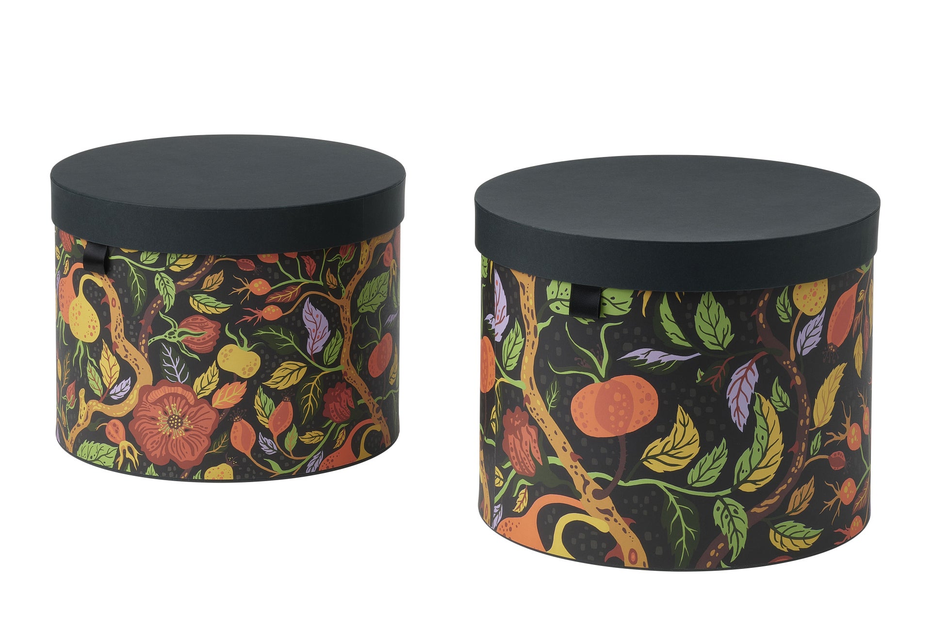 このふた付きボックスのセットは、自然界の活気ある秋色をインスピレーションにしたおしゃれなローズヒップ模様が特徴で、内側は相性のよいブラックです。 おしゃれで使い勝手のいいボックス。目隠し収納したいものをしまって手近に置いておけます。ふたを取り付ければ、ホコリが入らず、ボックスを重ねて収納できます。電子機器やデスクまわりの小物など、小さいものの収納にぴったりなサイズです。