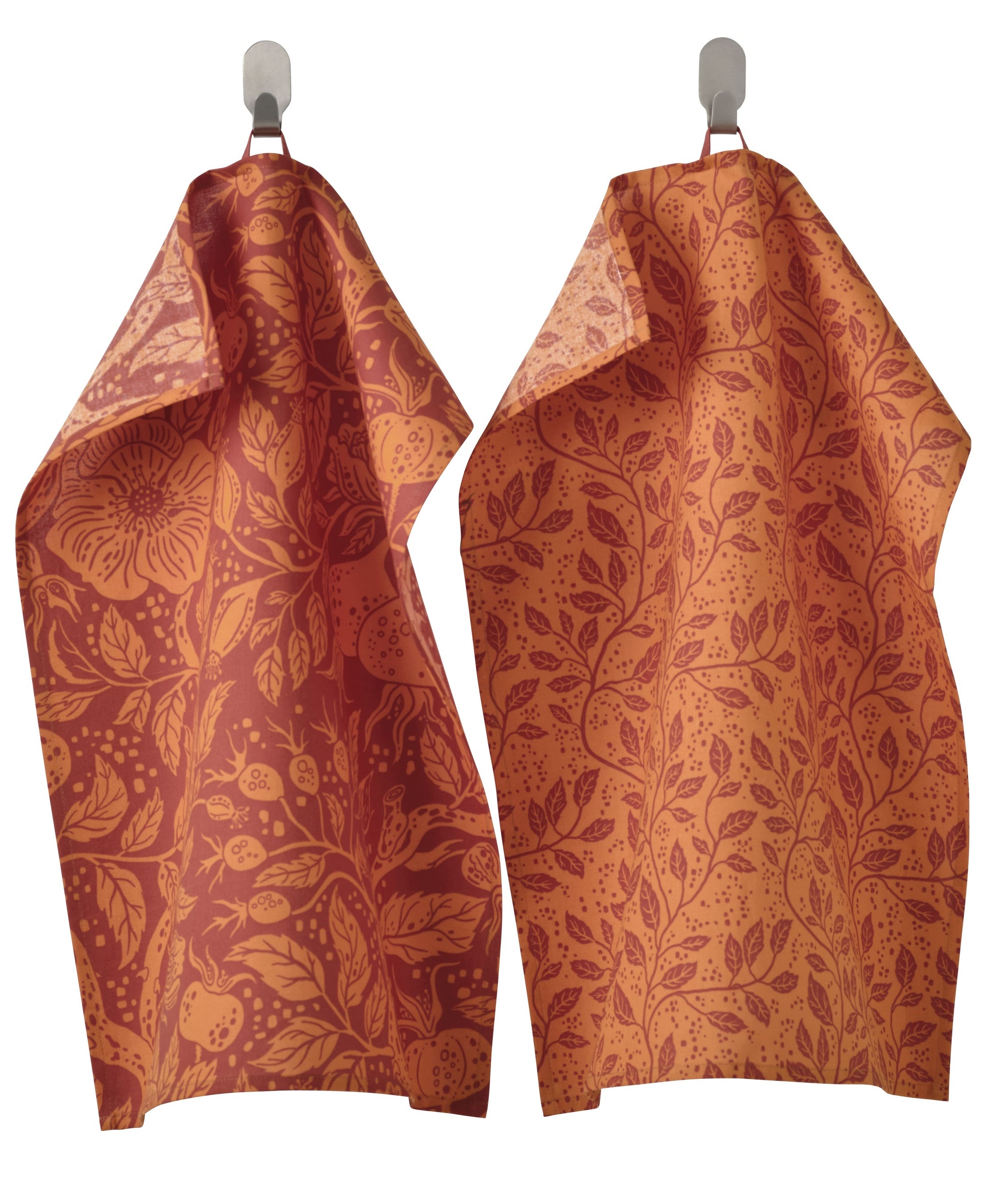 キッチンクロスの鮮やかな模様は、秋に色づくローズヒップがインスピレーションになっています。明るい秋色で相性のよい異なる模様がついたキッチンクロス2枚セット。キッチンにさわやかな彩りを添えて、料理やお菓子づくり、皿拭きをさらに楽しくしてくれます。