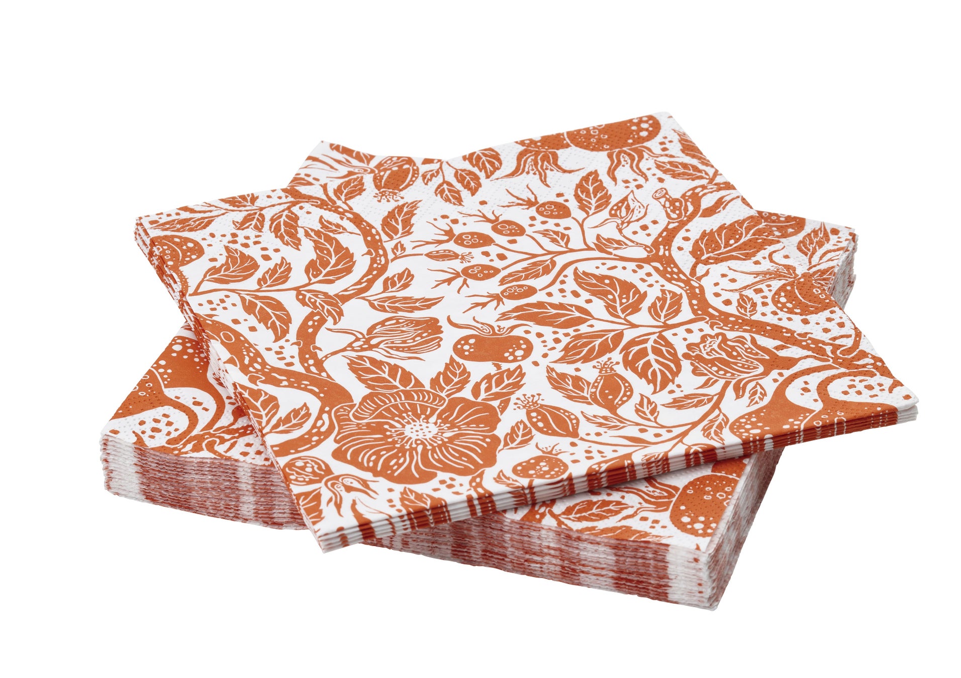 明るい色と模様で秋を迎えましょう。オレンジ色のローズヒップ(実)、つぼみ、咲き誇るバラの花が描かれたこの紙ナプキンは、テーブルコーディネートに温かみのある心地よい秋の雰囲気をつくり出します。