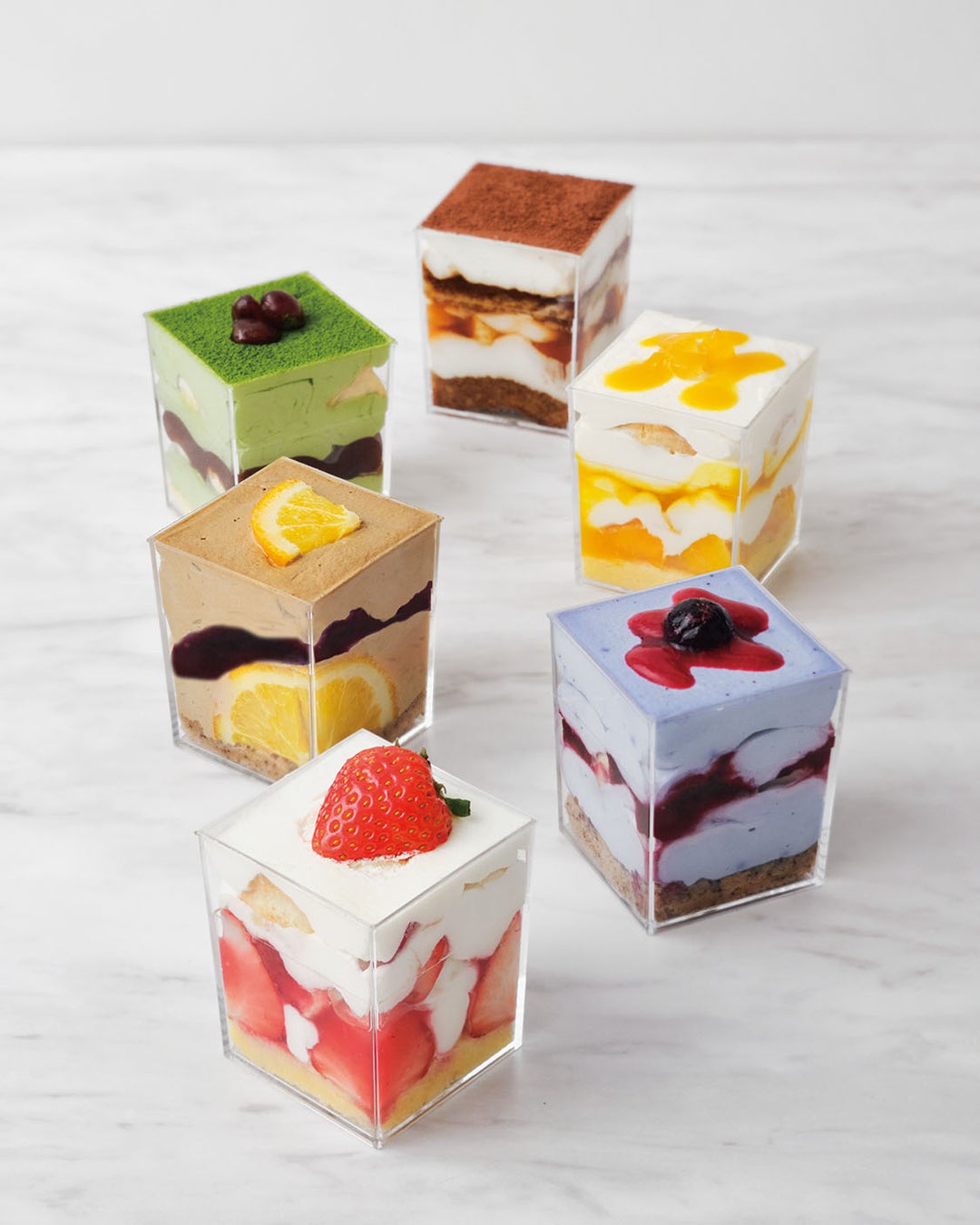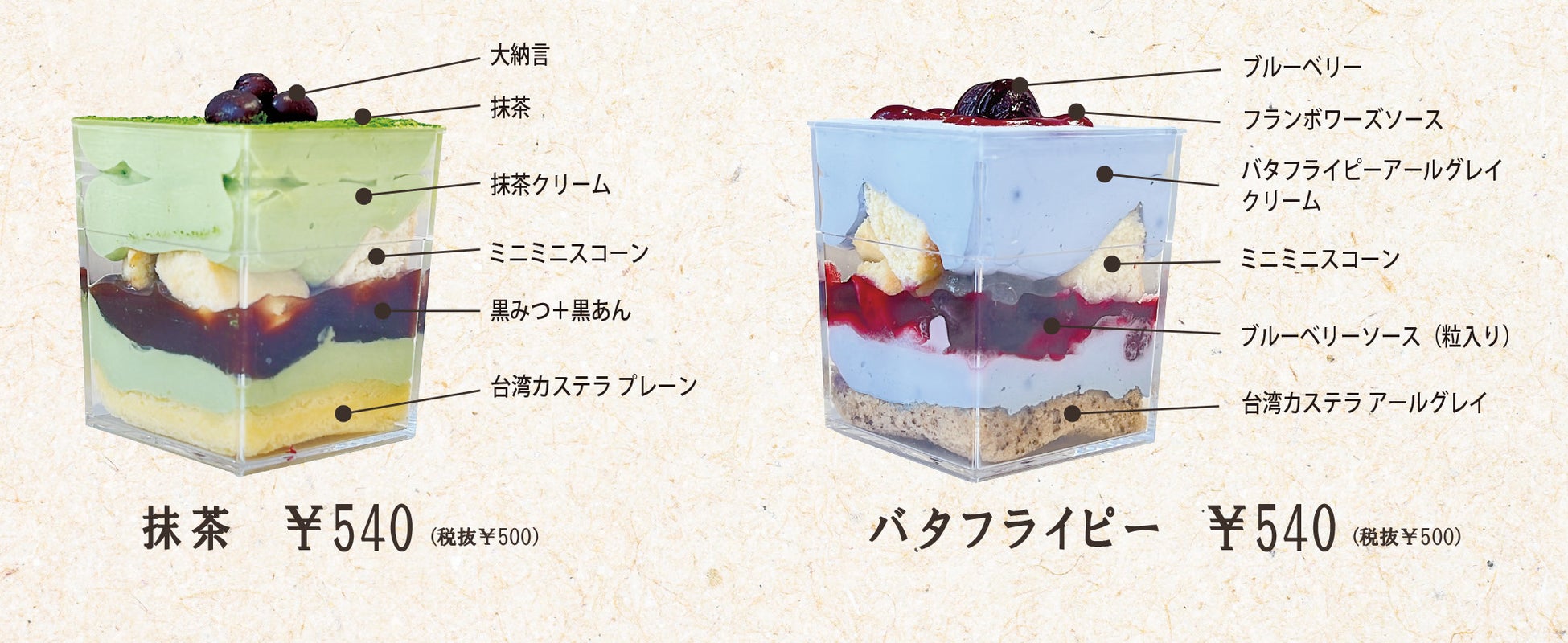 ふわふわの自家製台湾カステラの上に、それぞれ味が違う生クリーム&ソースとフルーツなどを詰めこみ、まるでショートケーキのように仕上げました。