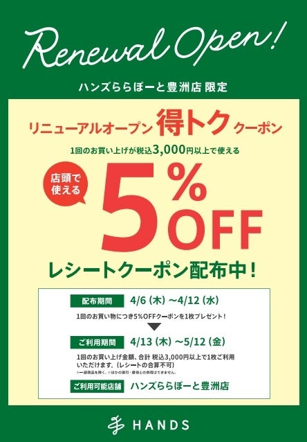 リニューアルオープンを記念して、ハンズららぽーと豊洲店の店頭で使える5%OFFクーポンを配布しています。