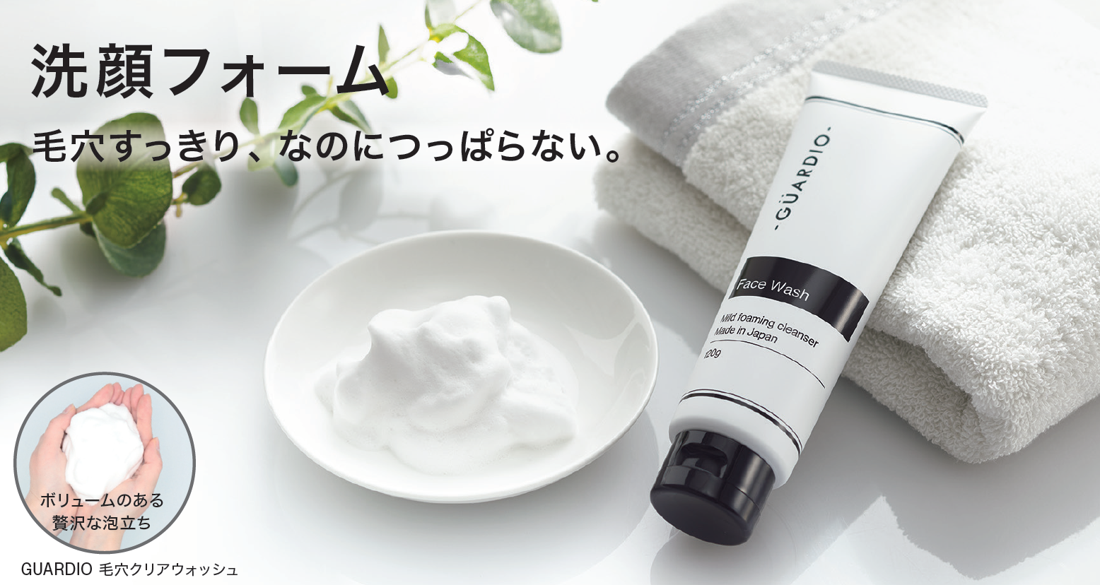 まずは、贅沢な泡立ちで毛穴汚れまですっきりクリアに落とすのにつっぱらない、保湿成分配合の洗顔フォームGUARDIO毛穴クリアウォッシュで、古い角質や毛穴汚れをしっかり洗い流します。
