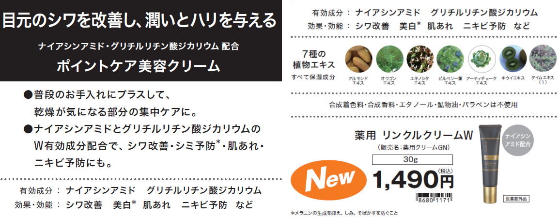 この度ニトリは、シワ改善効果・美白(*1)効果・肌あれ防止効果を兼ね備えた美容成分のナイアシンアミドに加え、ニキビ予防に効果的なグリチルリチン酸ジカリウムのダブル有効成分を配合したポイントケア用美容クリーム(商品名:GUARDIO 薬用リンクルクリームW/販売名:薬用クリームGN)30gを、1,490円(税込)というお求めやすい価格で実現しました。
