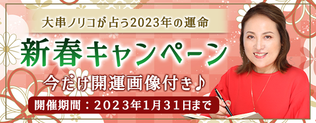 『新春キャンペーン』では、対象鑑定をご購入された方全員に、大串ノリコオリジナル「2023年の開運画像」をプレゼント致します。対象鑑定には、2023年の運勢を占うプレミアム鑑定を新たにご用意致しました。ぜひこの機会に大串ノリコの占いと開運画像で、2023年の運気をアップしていきましょう。