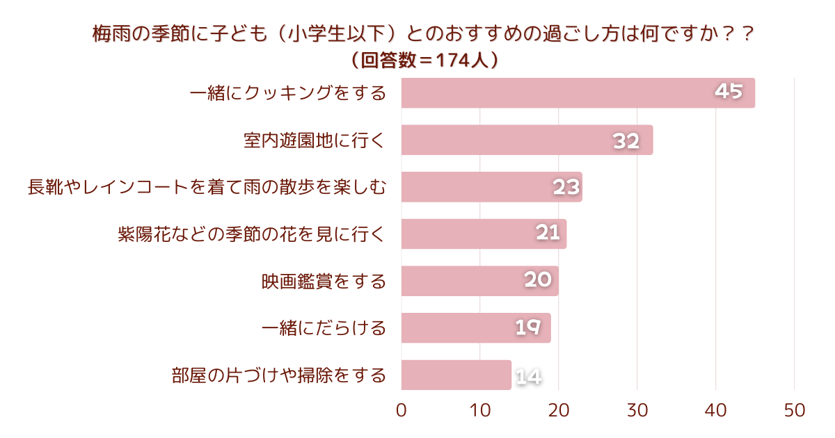 「梅雨の季節に子ども(小学生以下)とのおすすめの過ごし方は何ですか?」とアンケート調査した結果、1位は『一緒にクッキングをする』でした。