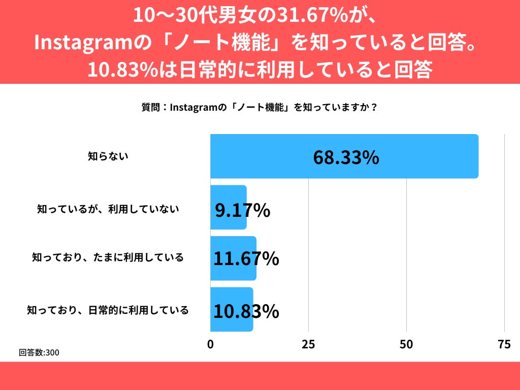 10~30代男女の31.67%が、Instagramの「ノート機能」を知っていると回答。10.83%は日常的に利用していると回答【Instagramの「ノート機能」に関するアンケート】
